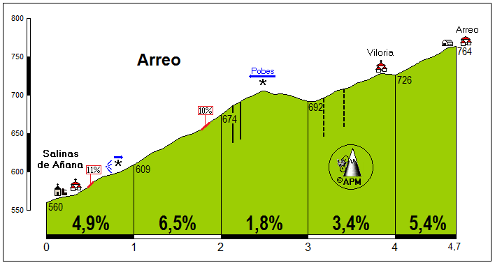 Comentario: No se trata de una ascensión de entidad, pero merece la pena acercarse por allí para conocer el llamado Valle Salado de Añana. Un complejo salinero explotado desde hace ya casi 7.000 años. Entonces la sal se obtenía hirviendo el agua salada, que mana abundantemente de forma natural, hasta que la sal disuelta cristalizaba. Luego ya en la época romana se cambió al diseño actual de las típicas eras (pequeños estanques artificiales poco profundos) en los que el agua se evapora por la acción solar. De todos es conocida la importancia y el valor de la sal en siglos pasados (de ahí viene la palabra salario). Las salinas de Añana, que dan el nombre a la localidad, nunca se han dejado de explotar, aunque mediados el siglo XX estuvieron a punto de desaparecer. Sin embargo, una modélica restauración ha hecho que hoy estén en todo su esplendor, produciendo diferentes tipos de sales ecológicas de alta calidad y reconocido prestigio, alabadas por cocineros de élite. El complejo está declarado como Monumento Histórico y en 2017 ha sido incluido el el Patrimonio Agrícola Mundial por la FAO, siendo hasta el momento el único entorno europeo en conseguir tal distinción. Otra curiosidad es que Salinas de Añana fue la primera localidad en ser reconocida como villa en Euskadi. La ascensión en sí es muy agradable. La rampa más dura la tenemos casi al principio, aunque podremos hacernos los gallitos pegando un arreón porque nada más superarla, tenemos un magnífico mirador, de parada obligatoria, para contemplar todo el complejo salinero mientras bajan las pulsaciones. Luego la pendiente se modera y solo encontraremos otra corta rampa que llega a los dos dígitos. Tras trazar dos herraduras y poco antes de coronar por esta carretera que nos llevaría hacia Pobes, tomamos un cruce a la derecha señalizado hacia Viloria y Arreo. Al principio tenemos medio km en descenso antes de comenzar a ascender hacia Viloria, pequeña aldea de apenas 20 vecinos. Un descanso y la última rampa que finaliza un poco antes de las primeras casas de Arreo, que aún tiene menos vecinos. Por la otra vertiente descendemos hacia un pequeño lago natural y encontramos varias carreteras vecinales bien asfaltadas por las que es una gozada pedalear. Todas ellas nos llevan hacia el valle del Ebro.