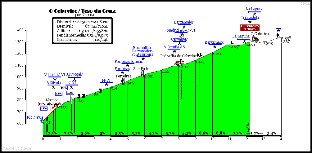 Comentario: Esta vertiente de O Cebreiro comparte con A Pintinidoira o con Penas de Comeal los primeros 7,9km. La verdad es que todos estos puertos que comparten una parte muy importante de su trazado, tienen igualmente una parte final bastante similar. Y es que a partir de Pedrafita todos tienen una continuación en la pendiente que acaba por romperse para tener un final irregular. Además, esta vertiente de Noceda es una especie de variante de la vertiente de As Nogais, que cuenta con un mayor desnivel. Eso sí, el inicio por Noceda aporta una mayor dureza al tener una pendiente mucho más dura, sobre todo en los muy exigentes primeros 800m. Además, como ya he comentado en otra altimetría este paso por Noceda es uno de los más extremos de todo Ancares.