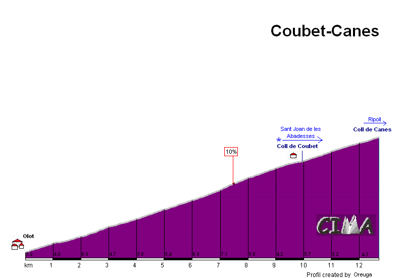 Comentario: Desde el margen derecho del río Ridaura, a las afueras de la ciudad de Olot. Podemos dejar nuestro vehículo en el barrio del Hostal del Sol, donde procedemos a comenzar una ascensión que no conlleva ningún problema, ya que aunque la carretera siempre tira hacia arriba, lo hace de una manera bastante homogénea. Ünicamente en el km. 7 encontraremos que el porcentaje nos aprieta un poco más, llegando a tener alguna rampa cercana al 10%.
