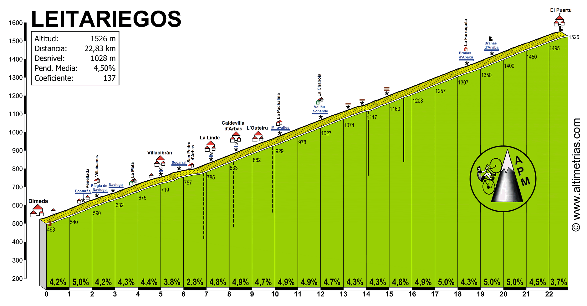 Descripción: Posiblemente el puerto asturiano de paso hacia la meseta más antiguo. Inicialmente llamado Tseitariegos, ya fue utilizado por los romanos que lo usaban para llegar a sus explotaciones auríferas del NO de León. Luego sería camino real de una gran importancia ya que, dada su escasa pendiente, era ideal para acarrear mercancías usando la tracción animal. Curiosamente, no es un hecho nada habitual, en la misma cima se asienta la población de El Puertu, con unos 50 habitantes que la convierten en una de las localidades españolas situadas a mayor altitud. A finales del siglo XIX tenía más de 400 habitantes. En el siglo XIV se les concedió a los vecinos la exención de impuestos y la no obligatoriedad de prestar el servicio militar, en compensación por la ayuda que prestaban a los viajeros. Con la llegada del motor se buscaron vía más directas y en la actualidad no es demasiado transitado. Dispone de una estación de esquí que se está ampliando y que le da una nueva vida a El Puertu. Un puerto que se hace eterno por sus 23 km de longitud, que no por su dureza. No tiene ni una rampa mínimamente reseñable. Ningún kilómetro supera el 5% de pendiente media. Dicha pendiente es de una enorme regularidad, ya que todos los kilómetros, excepto el sexto y séptimo, se mantienen entre el 4 y el 5%. Por tanto, ya tenemos claro que la exigencia no va a ser mucha y solo hay que armarse de paciencia, buscar el ritmo más adecuado y “p’arriba”. Y no olvidad ir surtidos de agua porque ya hemos dicho que no existen fuentes. Hay un par de bares, pero no podemos estar seguros de que estén abiertos, dado el escaso tráfico que circula por esta carretera. En la primera parte pasamos por varios puntos habitados, pero apenas tienen unas pocas casas y muchas de ellas deshabitadas. A partir de media ascensión solo encontramos La Farruquita, una antigua venta hoy convertida en casa particular y carpintería, y dos aldeas bastante por debajo de la carretera, Brañas d’Abaxu y Brañas d’Arriba. Desde el punto de vista paisajístico, no es que sea espectacular, pero sí tiene una cierta belleza. El inicio es bastante arbolado y no permite vistas. Luego va apareciendo el típico paisaje astur de prados, bosques y alguna casa. Y a partir del cruce hacia Vallau y Sonande, el arbolado va desapareciendo totalmente y nos abre unas amplias y relajantes vistas. Si la ascensión la hacemos poco antes del inicio del verano, tendremos el brezo florecido y los montes teñidos de un color rosa-magenta realmente espectacular. |