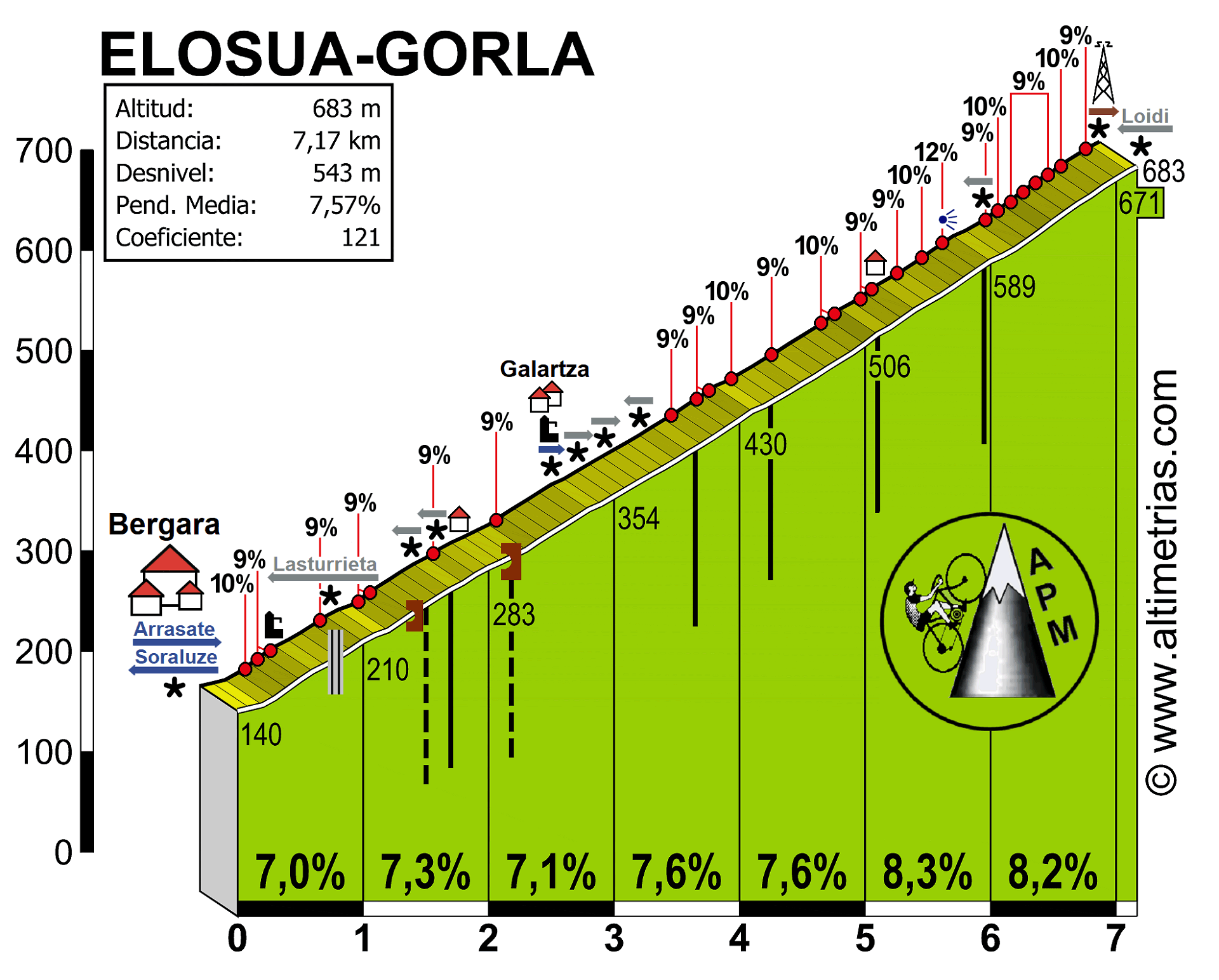 Descripción: Rodeada de verdes montañas, Bergara es una ciudad de la comarca guipuzcoana de Debagoiena, eminentemente industrial y de servicios, que mira con orgullo a su pasado. Fue punto de confluencia de mercaderes en la Edad Media y ya en la época de la Ilustración destacó por sus centros de enseñanza y su famoso Seminario de Nobles. Un siglo más tarde fue escenario de la 1ª Guerra Carlista, finalizada en el conocido Abrazo entre los generales Maroto y Espartero. Otra de las características que hacen especial este municipio es su ubicación en un importante nudo de comunicaciones, a menos de una hora de camino de las tres capitales vascas. Con el paso de los años, Bergara ha sabido conservar su casco histórico monumental, jalonado por notables edificios e iglesias, entre los cuales destacan la parroquia de San Pedro de Ariznoa, la torre Olaso y los palacios de Egino-Mallea e Irizar. De esta villa parte la tradicional subida a Gorla, que es una de las pruebas ciclistas de mayor solera en Euskadi y que bien merece la fama que ostenta en el ciclismo vasco. Es más conocida por este nombre en los ambientes bicicleteros que por el de Elosua, que es el que se le atribuye en la mayor parte de la cartografía de la zona. Es este último un núcleo de población que se ubica en la ladera opuesta, bajando hacia Azkoitia y el valle del Urola, siendo Gorla un topónimo que da nombre a un paraje concreto junto al punto en el que se corona, empleándose más esta última denominación para la vertiente que asciende desde Bergara, la que ahora comentamos. Junto al semáforo en plena calle de la célebre villa iniciamos una fuerte rampa que pronto se va a situar cerca del 10%, en el barrio de Bolu. Una amplia vaguada izquierda, en doble curva, nos aleja definitivamente de las últimas casas para adentrarnos poco a poco en una ascensión de 7 km con pendiente mantenida entre el 7 y el 8%. Las 5 curvas de herradura se van a ir sucediendo, mientras la sombra de los pinos dispersos va suavizando el impacto de los rayos solares, temibles en días de bochorno. Varias rampas de doble dígito irán apareciendo a nuestro paso y nos obligarán a redoblar el esfuerzo que ya nos está exigiendo la regular dureza del puerto. Desde la última herradura a la cima ya no encontraremos árboles que nos protejan, justo cuando vamos a afrontar el kilómetro más empinado de toda la escalada. Cuando dejamos a nuestra derecha la antena y una ermita del monte Itxusmendi estaremos a punto de lograr el definitivo descanso que da paso a un precioso y entretenido descenso hacia el valle del Urola.