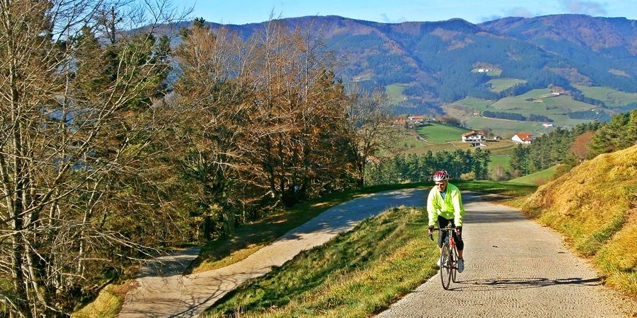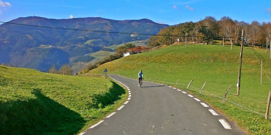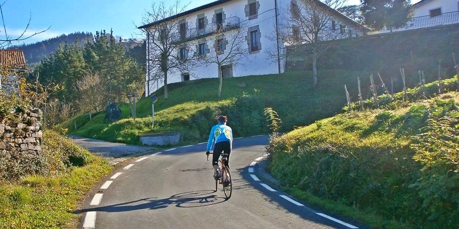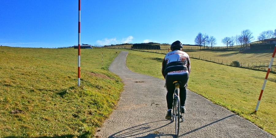 Descripción: Quien afronte por primera vez esta ascensión, no debe tomársela a la ligera, ya que se llevará una sorpresa. No siendo muy conocida, solo llega hasta el caserío Amesti de nueva construcción, valga esta altigrafía para que quien la aborde, no se llame a engaño. Las cifras no mienten: 9,26% de pendiente media, la misma que otros puertos de relumbrón como Peña Cabarga o Urkiola, pero km y medio más largo. Los puertos existentes en la península, con este porcentaje y más de siete km, se pueden contar con los dedos de una mano. Así que avisados estáis. Hemos optado por mantener el nombre de Samiño, bastante extendido en los foros, aunque el más apropiado sería el de Arkiña o Larrumelarre que es como se denomina la cota del pastizal donde acaba el ascenso. Samiño es la cumbre más alta del cordal, pero se encuentra a un km de distancia en línea recta. Hecho este inciso, vamos con la ascensión, que desde el inicio no nos va a dar tregua: los dos primeros km, por terreno mixto de bosque y prados, presentan una pendiente muy sostenida, por encima del 9% de media, aunque sin rebasar en ningún punto el 12%. No será hasta mediado el tercer km, cuando nos encontremos con el único descanso, saliendo a terreno abierto para describir un amplio arco, que nos permitirá unas excelentes vistas. Pero la calma dura poco, ya que nos encontramos con km y medio por encima del 8% antes de llegar al barrio de Martirieta. Poco antes habremos pasado por la entrada a un caserío con un nombre que sorprende en estos parajes: Jibraltar (sí, con J), o euskaldunizado como Txibilter. Hemos tratado de buscar el origen de tan curioso topónimo, sin éxito. Aunque sí hay referencias a que muchos navíos guipuzcoanos participaron en las grandes batallas navales que a lo largo de los siglos se desarrollaron junto al Peñón. Probablemente el nombre venga de algún vecino participante en alguna de esas batallas. En el barrio de Martirieta (o Zendoia), encontramos un restaurante, un par de caseríos y la ermita de los Mártires Emeterio y Celedonio, con una curiosa leyenda sobre su construcción. Quien tenga interés, no tendrá dificultades para encontrarla en la red. Otro km al 9% nos lleva hasta el barrio de Arrieta Mendi, donde vamos a la izquierda, abandonando la carretera que llevamos que comienza a descender. Dejamos un primer cruce a la derecha y tomamos el segundo, unos metros más adelante, donde comienza el hormigón. En ambos está señalizada la dirección hacia Amesti, que es nuestra meta. A partir de aquí comienza un terreno absolutamente irregular, con continuos cambios de pendiente, algo habitual en estas pistas de montaña que se adaptan a las anfractuosidades del terreno. En el km 5,6 debemos prestar atención en tomar dos herraduras encadenadas y no seguir de frente en la primera, ya que ese camino solo lleva a un caserío. Continúa una fuerte rampa, junto a unas magníficas hayas, con un 17% de pendiente y tras trazar dos herraduras, avistamos ya en lo alto, el caserío Amesti. Tras un paso canadiense, entramos en la traca final, un precioso trayecto a través de una pradera, sin ninguna valla, que casi parece un parque. Casi ni nos daremos cuenta que estamos superando un 18%. Al final de la rampa llegamos a otro paso canadiense, y los últimos metros son casi llanos. Recomendamos un corto paseo a pie, desde este último paso hasta el cordal, para contemplar unas espectaculares vistas de Gipuzkoa, alcanzándose a ver el mar si el día está claro. Preciosa y dura ascensión.