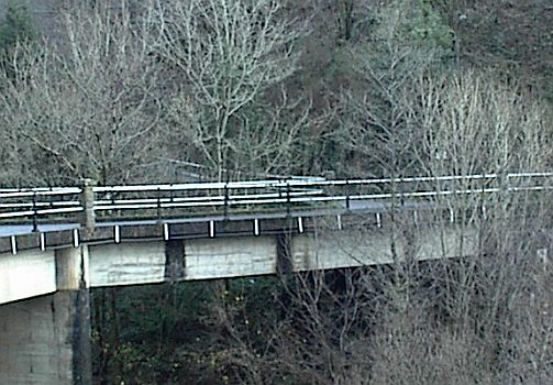 | Zoom aplicado al puente sobre el Río Eume para poder distinguir al fondo la primera rampa de la subida, se trata de un tramo hormigonado de unos 50 metros tras el cual encontramos la carretera en sí. La pendiente ronda el 10% y anticipa el infernal Km 1 que nos aguarda. |