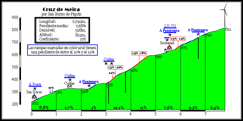 Sin duda Cruz de Meira es un puerto que cuenta con muchas vertientes y variantes, siendo ésta de San Xurxo una de las más duras. Es un puerto bastante irregular, con varias zonas donde la pendiente es muy suave e incluso favorable. Pero esta vertiente también cuenta con zonas muy exigentes, como la zona central donde hay 1.600 metros con una pendiente media que supera el 13%. Además, dentro de esta zona, hay zonas con rampas muy inclinadas que se acercan al 20%.