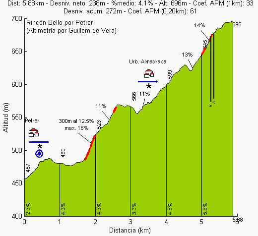 Circularemos por una pista asfaltada que, como suele suceder en la orografía alicantina, sufre numerosos cambios de pendiente, pudiendo alternar en pocos centenares de metros tramos llanos con otros de pendiente de doble dígito. Esta es sin duda la razón por la que el coeficiente de dificultad calculado con tramos de 200m (61) es mucho mayor que el calculado con tramos de un kilómetro (33). Como claro ejemplo de ello está el segundo kilómetro de la altimetría. Este es al 4,3% y, si calculamos el coeficiente con tramos de un kilómetro, a este kilómetro le corresponde un coeficiente de 5,6 (véase tabla de coeficientes). Sin embargo, observamos que sus últimos 300m son al 12,5%. Un kilómetro completo al 12,5% tiene un coeficiente de 54, por lo que a 300m le corresponde un coeficiente de 0,3x54 = 16,2. Es decir, la dificultad de los últimos 300m del segundo kilómetro de la altimetría es superior a la del kilómetro entero si lo calculamos con tramos de un kilómetro, lo que pone de manifiesto que el cálculo con tramos de un kilómetro subestima manifiestamente la dificultad en recorridos en los que la pendiente cambia considerablemente en cortos tramos. En este tipo de trayectos, el coeficiente calculado con tramos de 200m es más significativo que el calculado con tramos de un kilómetro. Nos enfrentamos por tanto a un puerto que, sin resultar especialmente duro, su dificultad sí que es aproximadamente el doble de los que parece indicar su coeficiente calculado con tramos de un kilómetro.
