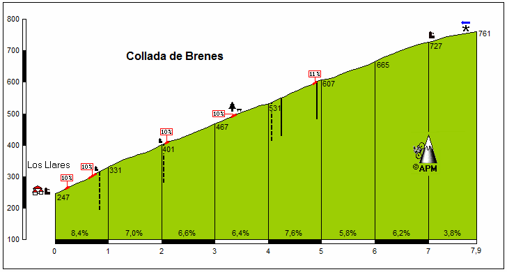 Comentario: Esta vertiente es mucho más llevadera que la del lado norte, por cuanto no encontraremos ninguna rampa fuerte. Apenas si rozamos los dos dígitos de pendiente en cuatro o cinco puntos. El km más duro es el inicial, siendo el resto de una pendiente sostenida, hasta llegar al último que es muy suave. Una ascensión para disfrutarla con tranquilidad y admirar el paisaje, que en su parte final es grandioso, alcanzándose a ver el mar Cantábrico. La vegetación también es bastante cambiante, por zona boscosa hasta llegar al área recreativa que nos recibe con un magnífico acebal. A partir de ahí, los árboles van menguando, hasta desaparecer, para dar paso a pastos de montaña en la parte final. En la cima, sigue una pista de tierra en bastante buen estado, con no mucha pendiente, que sigue ganando metros, hasta el pico Tordías. Si vamos con BTT, es una variante recomendable para seguir por ella y descender hasta Bárcena de Pie de Concha. De hecho, los de Street View, se han metido por ahí. Si vamos con bici de carretera, para descender por la otra vertiente tendremos que tomar el cruce a la derecha que sigue asfaltado. Precaución al descender, ya que podemos encontrarnos con ganado suelto.