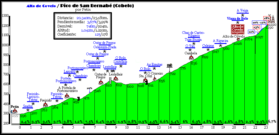 Comentario: La mayor parte del puerto transcurre por los municipios orensanos de O Bolo y Petín, aunque la zona final de acceso a la antena se adentra en Viana do Bolo y en los últimos metros toca A Veiga. De los dos primeros municipios he habado en la altimetría de A Pedralta, y del de A Veiga he hablado en la altimetría de A Moeda-Alto da Portela. En Viana do Bolo el río Bibei recorre estas tierras montañosas acogiendo en sus parajes más intransitables a nutrias, martín pescadores y patos salvajes. La naturaleza se ha conservado virgen en gran parte del municipio por lo que en su flora abundan sotos de castaños centenarios, carballos, coníferas, abedules y alisos. La riqueza paisajística de Viana do Bolo no es el único atractivo de este municipio habitado ya desde la antigüedad. Su historia gira paralela a la de su castillo que, edificado en le Edad Media gozaba de fueros y gobierno propio. El puerto de Covelo es un paso interesante y más aún si se sube hasta las antenas situadas en el Pico de San Bernabé. El puerto parte claramente desde la desembocadura del regueiro de San Mariño con el río Sil, lo más difícil quizás sea ajustar bien el punto exacto de inicio, ya que en este tramo junto al río Sil hay una zona llana que no se ajusta mucho con los mapas que aún están sin actualizar. Lo que está claro es que los primeros 12km son los más llevaderos, ya que en ellos encontraréis los mayores descansos del puerto. Sin embargo a partir de este kilómetro el puerto coge mayor consistencia, quedándose estos últimos 11,18km con una pendiente media cercana al 5,5%. Por esto sin duda la vertiente más interesante es la que parte desde As Ermidas ya que además de recoger en su recorrido prácticamente todo este tramo, tiene unos primeros 1.600m realmente espectaculares y con rampas, que si se cruza por dentro del pueblo de As Ermidas son, realmente explosivas. Volviendo a la vertiente de Petín decir que las rampas más duras están en el acceso a la antena y más concretamente en los últimos metros, donde la carretera forma parte de un cortafuegos. Las vista desde la antena situado en lo más alto son muy amplias. Durante la subida hay también grandes vista del As Ermidas y de algún tramo del cañón del Bibei.