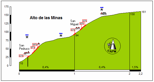 Comentario: Otra más entre las innumerables ascensiones cortas que encontramos en esta laberíntica red de pequeñas carreteras rurales que pueblan la bella zona entre Laredo y Santander al norte de la A-8. Una preciosa comarca para perderse (si no la conoces y no llevas mapa te perderás en sentido literal), con sus pequeños núcleos rurales con casonas de piedra, palacios, iglesias y ermitas. Y qué decir de su costa, una pena que hoy en día esté un tanto masificada, donde aún se pueden encontrar rincones casi vírgenes, a poco que nos apartemos de las rutas trilladas. La ascensión, aunque corta, tiene bastante dureza ya desde el inicio. Apenas llevamos cien metros y llegamos al barrio de San Pedruco ya con pendientes del 12%. El barrio queda un poco apartado a la izquierda y está presidido por su ermita del S.XV aunque edificada sobre otra románica que perteneció a los templarios y era punto de paso de peregrinos hacia Santiago. A la altura del barrio describimos una herradura a derechas y nos damos de bruces con la rampa más dura de la ascensión, que alcanza un máximo del 18%. Este primer embate habrán sido trescientos metros con una media del 15%. Algo más de medio km bastante suave y la segunda rampa, al pasar por los caseríos de San Miguel, igual de larga que la primera si bien su 12% de media la hace más llevadera. La pendiente va disminuyendo hasta llegar a un cruce frente a unos grandes establos. Desde aquí hasta la cima, un cómodo paseo ya que la pendiente apenas es significativa, lo cual nos ayudará a disfrutar de unas interesantes vistas. Y para descender por la otra vertiente, tenemos hasta tres alternativas: si tomamos el primer cruce a la derecha, descenderemos a Galizano por el alto del Castillo. Si tomamos el segundo llegamos a la CA-141 casi al final del descenso del alto de Ajo. Y si seguimos de frente, llegamos a la citada carretera, bastante cerca de la cima de dicho alto. Recomendamos la primera por sus vistas.