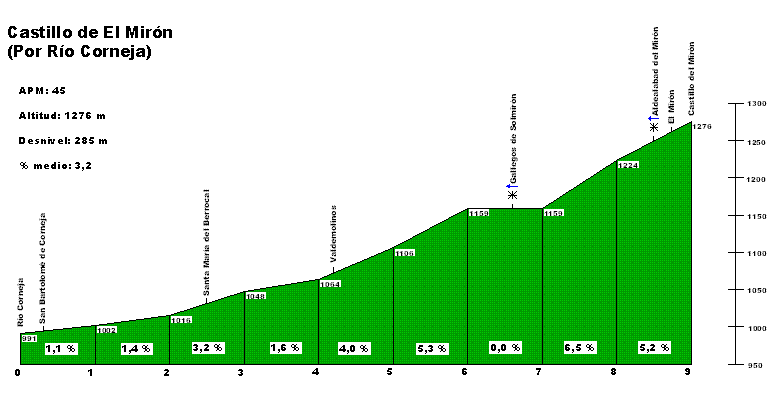 Comentario: La subida al Castillo del Mirón es una subida sin excesivas dificultades, pero que puede servir como un buen complemento a otros puertos cercanos de mayor entidad como Peña Negra. Comienza con dos km de falso llano y tras una ligera subida alcanzamos el pueblo de Santa María del Berrocal. Una vez atravesado, se alcanza el pequeño poblado de Valdemolinos, donde empiezan las primeras rampas de cierta entidad con 2 km al 4 y 5 %. Tras un breve descenso en donde tomamos el cruce a derechas que nos lleva hasta la cima, nos encontramos con los dos km duros de la ascensión, que sin ser extremos, pueden llegar ha hacerse largos ante la ausencia total de sombras. Finalmente, alcanzamos la localidad del Mirón, en donde no nos será difícil ubicar el Castillo, donde se pueden ver unas increíbles vistas del Valle del Corneja, la Sierra de Villafranca y de telón de fondo la Sierra de Gredos.