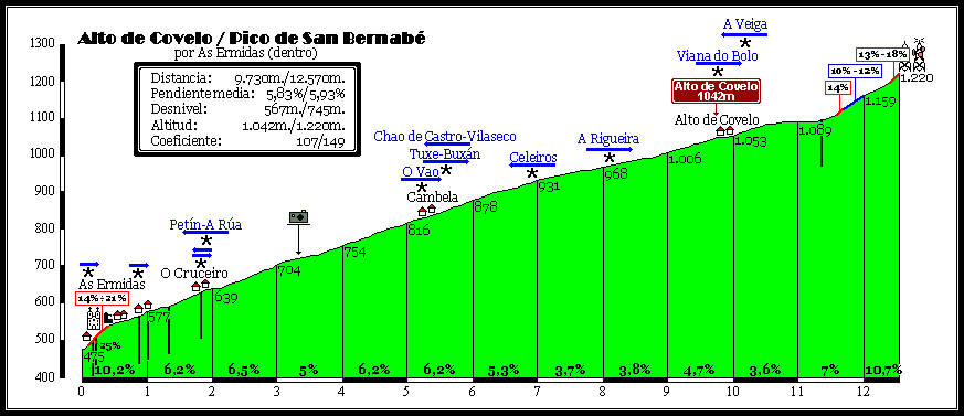 Comentario: Este puerto toca los siguientes municipios; O Bolo, Viana do Bolo y a Veiga. Mayoritariamente transcurre por O Bolo. De todos ellos ya he hablado en la altimetría de la otra variante desde Petín, o en otras altimetrías como la de A Moeda-Alto da Portela. Este puerto nace en plena garganta del río Bibei, un precioso enclave natural que ha sido transformado por el hombre con la construcción de un gran santuario mariano. Éste se puede considerar una de las mejores obras del barroco en Galicia. El complicado enclave escogido para la construcción parece que tiene que ver con el descubrimiento de una virgen en una cueva, por parte de unos pastores. El puerto arranca encajonado entre una enorme roca y el río Bibei. Según se pisa el adoquín la fuerte pendiente os exigirá todas vuestras fuerzas para conseguir pedalear. Las durísimas rampas iniciales llegan a tener un 25% de pendiente, que aún parecen más al ser sobre un suelo adoquinado. Pero estas contundentes rampas pronto desaparecen, ya antes de abandonar As Ermidas la pendiente suaviza y el adoquín desaparece para dejar paso a un asfalto rugoso con una pendiente que no llega a los dos dígitos. La verdad es que la mayor parte de la ascensión es suave, sólo este abrupto inicio y las duras rampas finales de acceso a las antenas llegan a ser duras o incluso extremas.