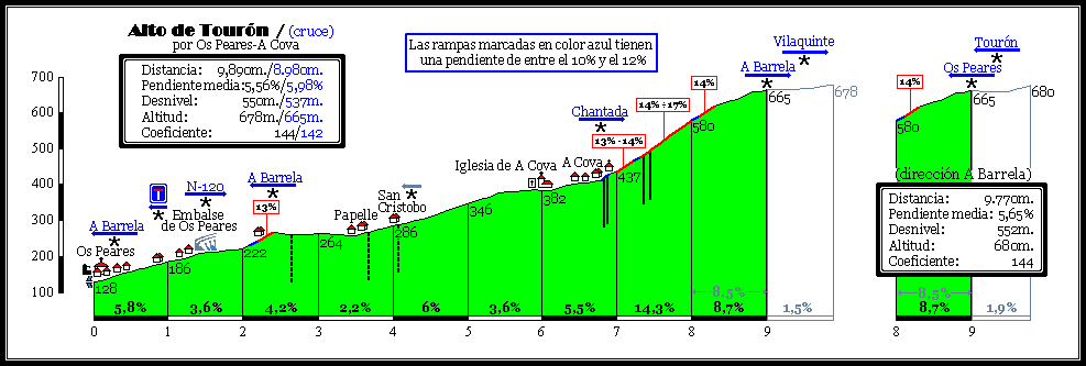 Esta vertiente del Alto de Tourón concentra toda su dureza en dos kilómetros asfixiantes donde os encontraréis una pendiente media del 12,30%. El resto del puerto tiene algún punto duro de escasa longitud y en general es un gran mirador, de esta zona de la Ribeira Sacra donde se encuentra el embalse de Os Peares.
