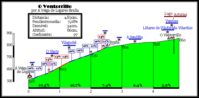 Comentario: Esta vertiente de O Ventorrillo fue la primera que medí. Realmente intentaba medir la vertiente luguesa más corta de este puerto, pero acabé por medir esta variante. La culpa es mía por supuesto, pero la señal que encontraréis en el km 1,3 me ayudó a equivocarme. Esta señal indica que el acceso al barrio de O Ventorrillo se hace por la izquierda, es decir, por el mismo trayecto de esta altimetría. Curiosamente este es el camino más largo, prácticamente 800m más. De todos modos, esta vertiente también es muy interesante pese a no alcanzar un coeficiente tan alto como la vertiente que cruza Vilagudel. En este caso la dificultad se concentra en los primeros 2,5km, donde la pendiente media se queda en el 10,7%. Después el puerto se amansa y sólo en los metros finales la pendiente vuelve a tener algo de intensidad, por decir algo.