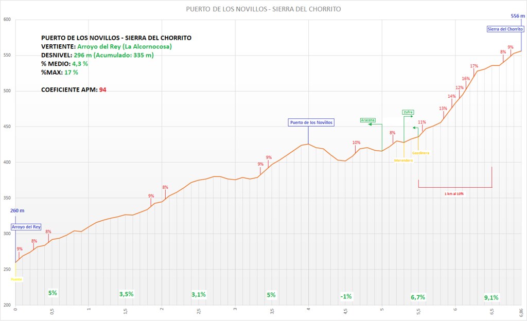 Comentario: Se trata de la ampliación del puerto de los Novillos, continuando, al llegar a Zufre, por una pista asfaltada, que sube a la cumbre de la Sierra del Chorrito. Esta pista asfaltada es la que le da la dureza al puerto, con 1 km a más del 10% de media, incluyendo varios tramos al 12 y 13 %, y dos tramos al 16 y 17% que se hacen muy duros.