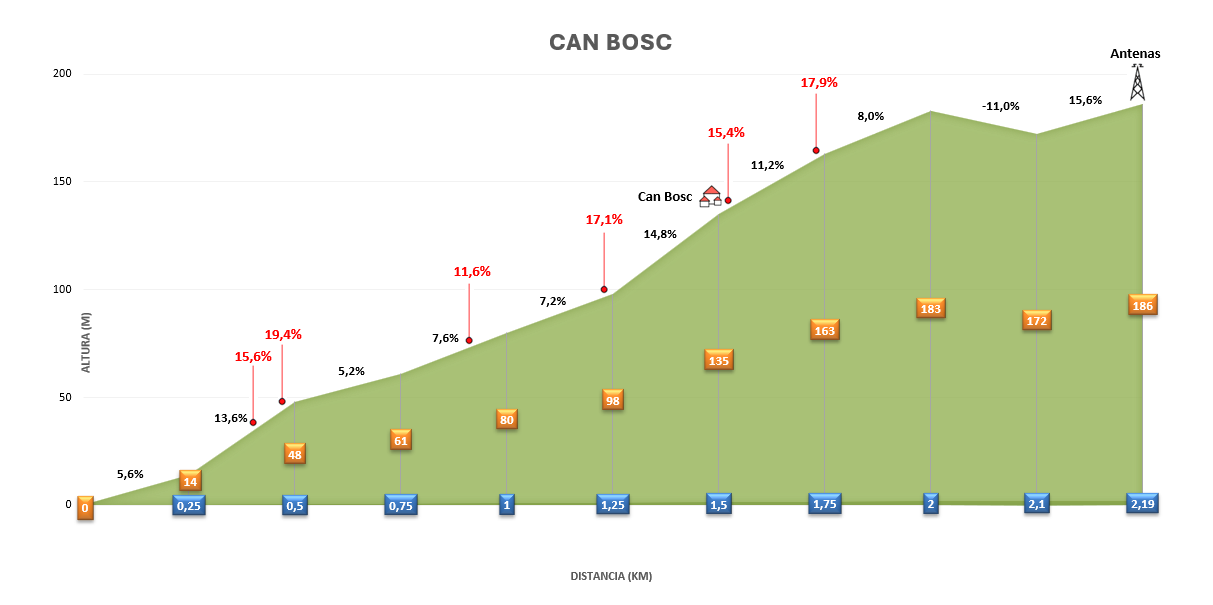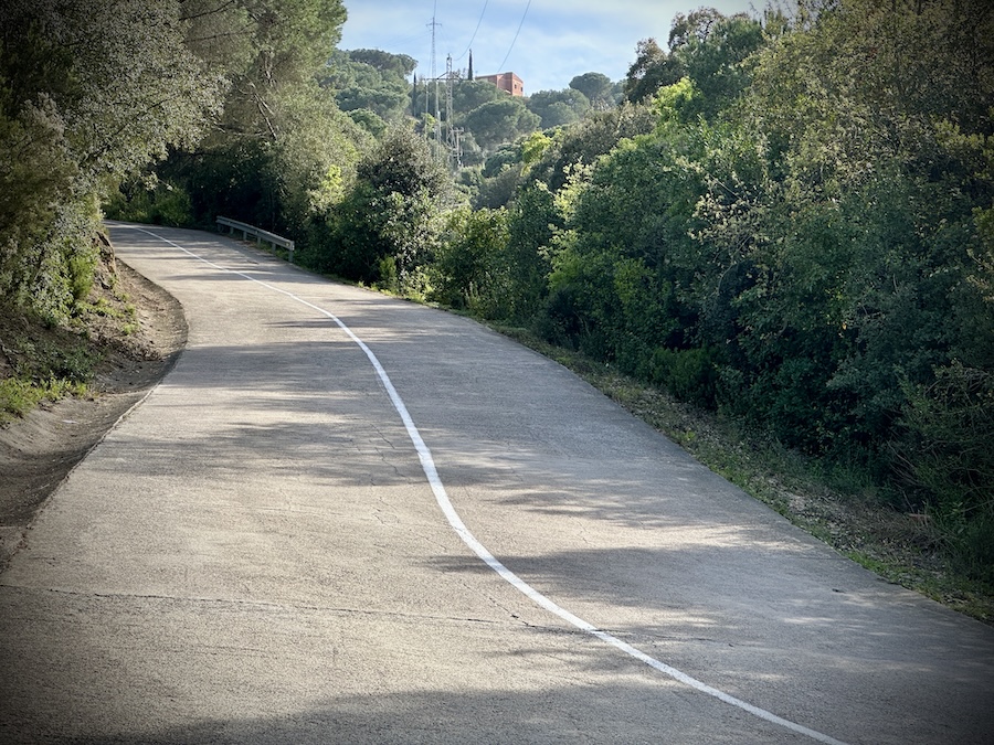 Después de iniciar la subida en el desvío del Barri Can Bosc, dejaremos atrás una pequeña casa a la derecha y subiremos suave hasta que encontraremos la primera rampa al 15,6%.