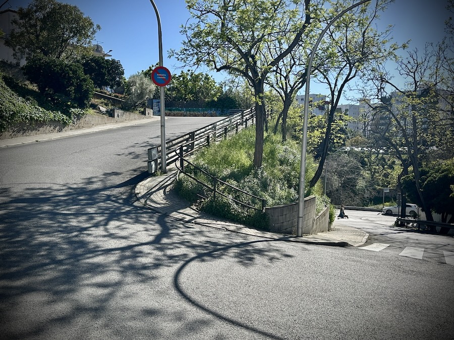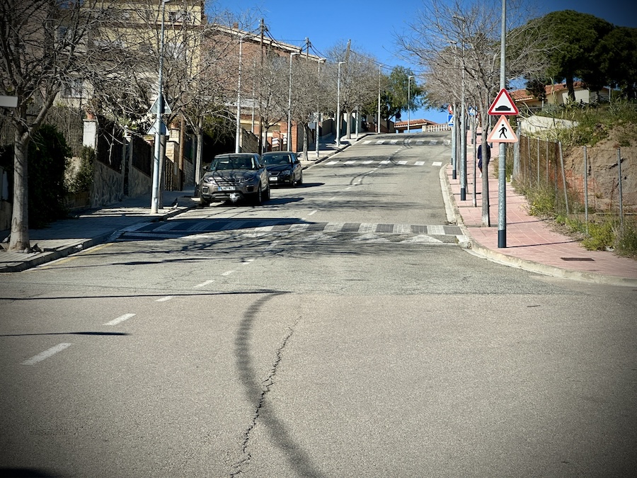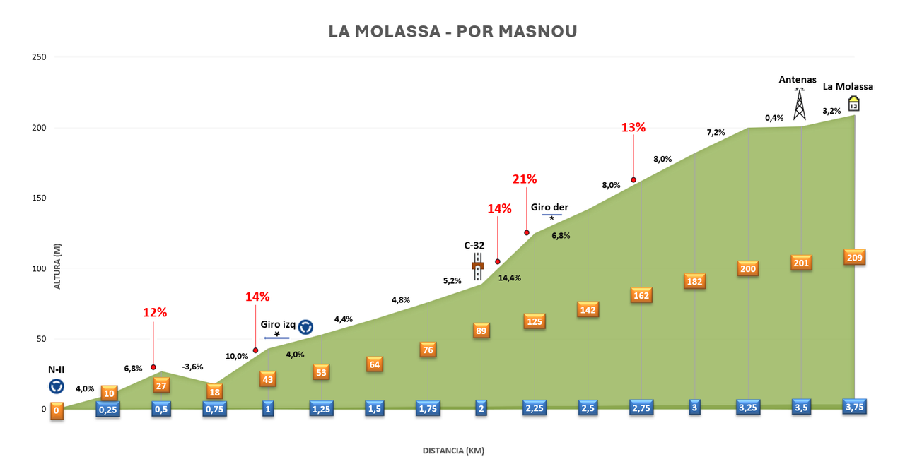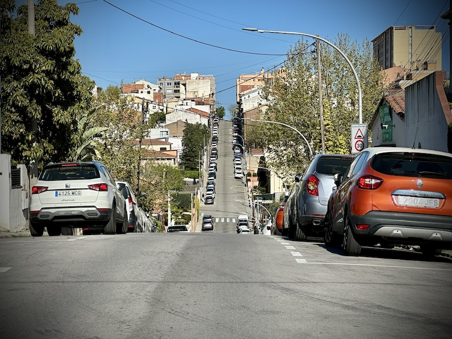 Pasaremos por el puente de la autopista y ahí empezará un pequeño infierno con una presentación al 14% y un final de ramp al 21%, es un muro muy duro. Al llegar a la parte superior giraremos a derecha para seguir la calle Montseny para más tarde volver a esta calle principal, ya que sino iríamos en contradirección durante 100m.