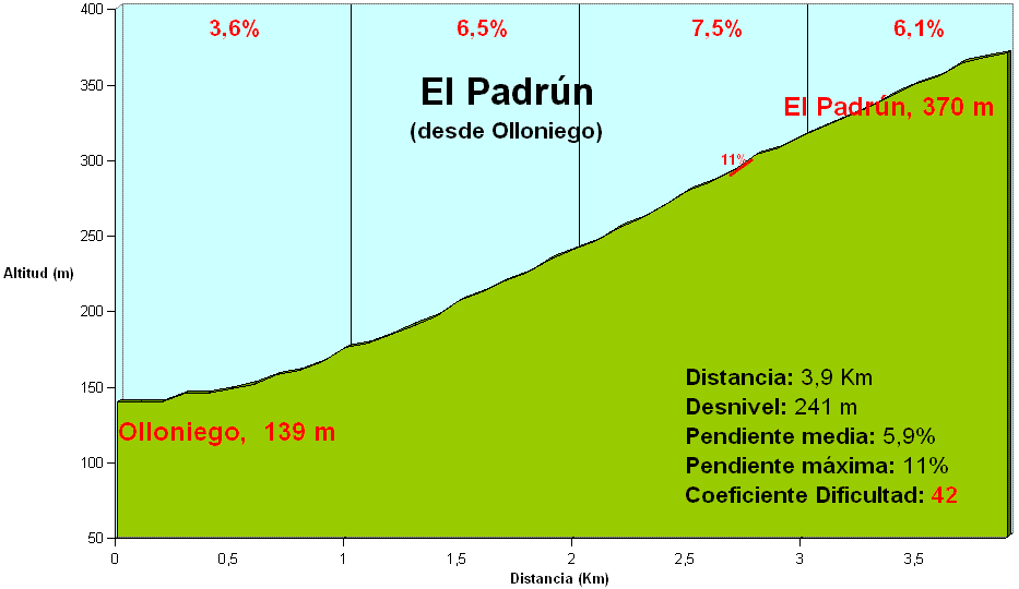 Comentario: A través de la antigua carretera Oviedo-Mieres (AS-242) y partiendo de Olloniego, comenzamos la ascensión a El Padrún, puerto de casi 4 Km a un desnivel medio de cerca del 6%, con rampas máximas del 11%. Una vez coronado continuaríamos a través de la AS-242 hacia Mieres, pasando por La Rebollada (nombre por el que se conoce la subida a El Padrún desde la otra vertiente).