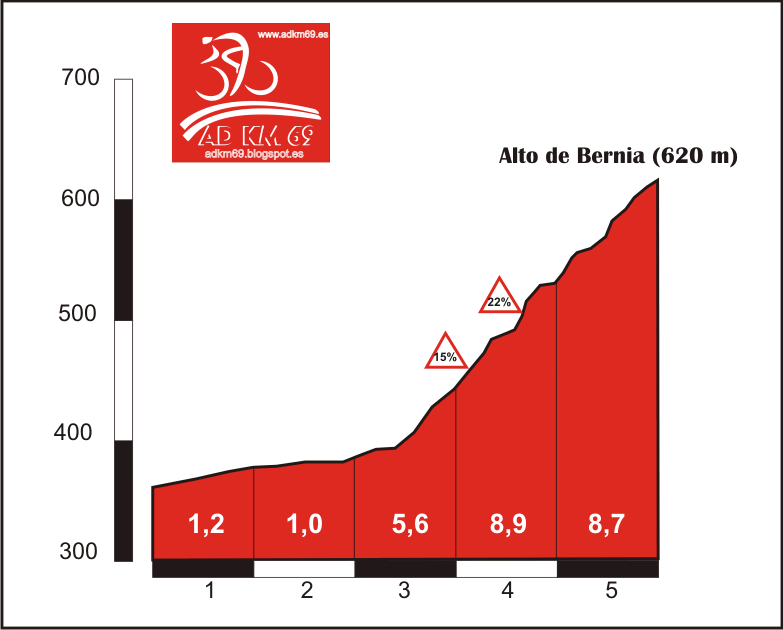 Comentario: Una auténtica encerrona. Vistos sus números parece un “bicho” fácilmente domable pero se hace muy duro, aunque afortunadamente sea cortito. Comienza con dos km inapreciables en los que uno no se llega a imaginar lo que se le viene encima. La visión de un primer repechón duro con puntas del 14-16% te hace temblar las piernas. El repechón acaba, pero la pendiente se mantienen alta, 8-9% en un par de curvas cerradas que existen, que dan paso a otro nuevo repechón de 300 m al 11%, tras el que viene un pequeño descanso con bajadita incluída. De nuevo se observa el siguiente escalón, una recta de 300 m al 16% con tramos del 22% que te dejan las piernas finas. Desde ese punto apenas si quedan 500 m al 10% antes de coronar este Alto de Bernia.