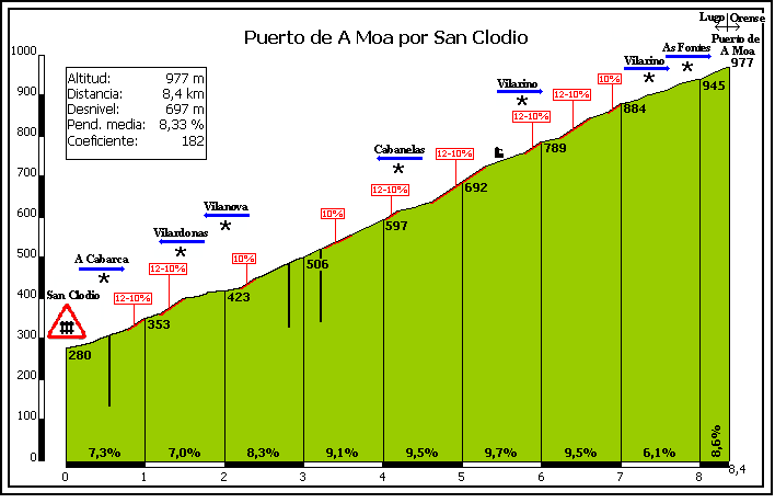 Comentario: Dedicado a Ruben Coca, Marcos Arias y German Arias. Es un Puerto muy duro, casi sin descansos y, aunque no tiene rampas duras (ninguna por encima del 13%), es muy constante en el 8-9-10-11% El final del Puerto coincide con el cambio de provincia de lugo a Ourense. Suele ser la estrella en la Marcha ciclista a Valdeorras.