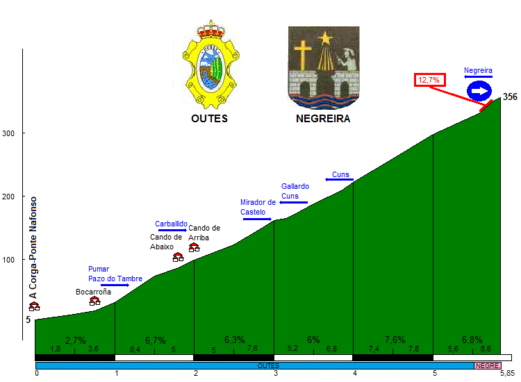 El primer kilómetro lo haremos ganando altura muy suavemente, yendo todo el rato entre casas que forman pequeñas aldeas, y a la salida de una de ellas, concretamente la de Bocarroña, afrontaremos medio kilómetro al 8,5% siendo quizás la parte más dura del recorrido junto a la última rampa. Pronto dejaremos a nuestra derecha el desvío hacia el bello Pazo do Tambre y ya iremos pedaleando entre arbolado.