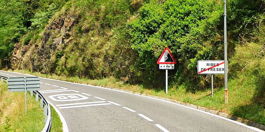 | Fuentes: Hay varias. La primera a 300 m del inicio, poco antes de un puente. Otra en la entrada a Planoles, en el Km 7, en un cruce hacia un camping. Una tercera en el Km 13,3 entre el cruce hacia Dòrria y una curva de vaguada. La última, en el Km 19,8, que pasa un tanto inadvertida, aunque suele haber humedad en la carretera. |