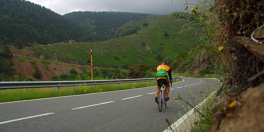 Descripción: Toda la ascensión discurre por la parte occidental de la bella comarca del Ripollès. Ribes de Freser es una bonita localidad cuya existencia está documentada ya en el siglo X. A mediados del pasado siglo alcanzó su culmen poblacional con más de tres mil vecinos debido al auge de las industrias del papel y textiles. En la actualidad no llega a los dos mil y se ha convertido en lugar turístico para todas las estaciones, aunque sin abandonar la actividad campesina tradicional. Conserva restos de su castillo, pero su iglesia del siglo XI fue destruida en 1936 durante la Guerra Civil, aunque se reconstruyó en 1945-46 usando parte de las ruinas. De Ribes parte el famoso tren cremallera que lleva al idílico enclave de la Vall de Nùria a dos mil metros de altitud. Es el único medio de transporte motorizado para acceder a ese valle. Este puerto no va a presentarnos ninguna dificultad, aparte de su distancia. Aunque son casi 900 metros de desnivel, ningún kilómetro llega al 5% de pendiente y un coeficiente de dificultad de 117 puntos para 25 km corrobora esta falta de dureza. Por otra parte es un puerto que se hace un tanto pesado en su primera parte porque aunque el paisaje es verde y agradable, resulta demasiado monótono, sin apenas variaciones. Luego las vistas son más amplias hacia el valle y montañas circundantes, permitiendo ver largos tramos del puerto hacia arriba y hacia abajo, pero aun así con poca variación. Tampoco existen núcleos de población que nos distraigan un poco (Planoles apenas lo rozamos) ni otros puntos de interés. Quien quiera más “chicha”, al salir de Planoles puede desviarse hacia Toses pueblo por una carretera más tranquila y un paisaje más variado y, a nuestro modo de ver, más bonito. Es más corto, pero a partir de Toses habrá que apretar los dientes porque tendremos que enfrentarnos a 4 km al 10% de media y rampas de hasta el 14%. |