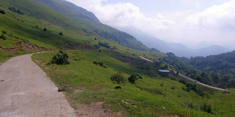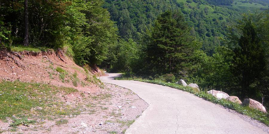 | Especificaciones: Carretera de 6 m de ancho, bien asfaltada hasta la entrada a Ogassa, con señalización vertical y línea de separación de carriles. En esta localidad comienza el firme de hormigón liso en buen estado y anchura de unos 4 m hasta Sant Martí de Ogassa. A partir de ahí la pista se estrecha y hay lugares en los que no llega a los 3 m, aunque el firme se conserva en perfecto estado. La parte hormigonada carece de señalización, exceptuando unos carteles con datos del puerto. Terreno muy boscoso con abundantes sombras y tráfico testimonial que desaparece a partir de Ogassa. |