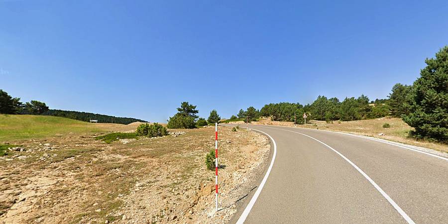 | Especificaciones: Carretera amplia, en perfecto estado y con señalización completa. Aunque hay buenos tramos de pinar, no vamos a encontrar sombras en las horas centrales del día, dado el escaso porte de los pinos y su separación de la carretera. Tráfico muy escaso, salvo en meses invernales ya que estamos ascendiendo a una estación de esquí. A tener en cuenta la época, ante la posibilidad de problemas por nieve, ya que estamos a 2000 m de altitud. |