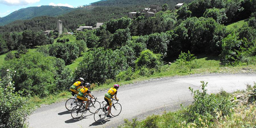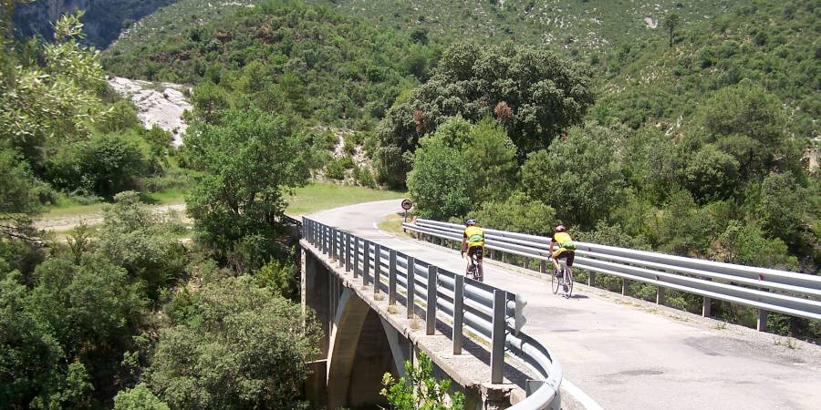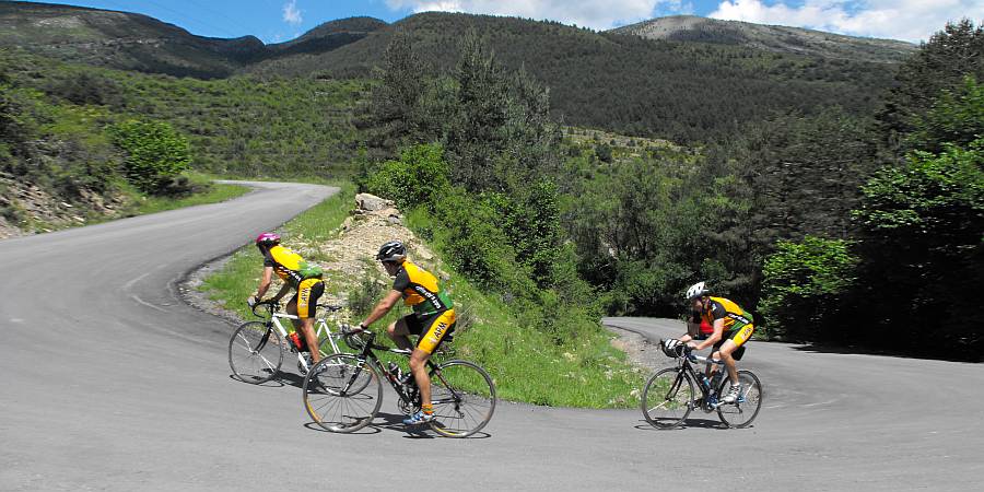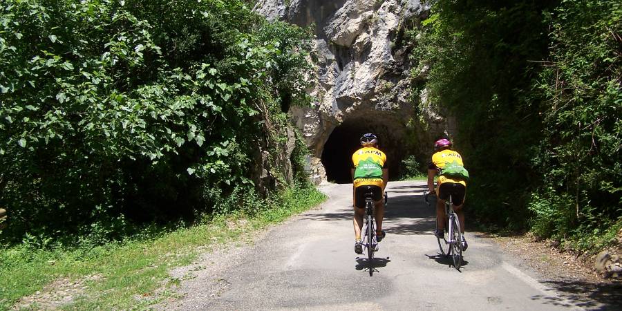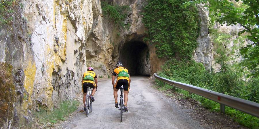 Descripción: Estamos sin duda en uno de los más bellos rincones de los Pirineos, en las estribaciones meridionales del parque Nacional de Ordesa y Monte Perdido. Vamos a seguir el curso del río Bellos (o Bellós) que durante millones de años ha ido erosionando la roca caliza hasta llegar a labrar esta impresionante garganta conocida como el Cañón de Añisclo. En los doce primeros kilómetros prácticamente no vamos a ver la luz del sol. Muchos tramos de este angosto valle nunca han visto un rayo del astro rey. La ruta, sin duda, va a ser un espectáculo inolvidable que guardaremos en nuestra memoria. Antes de nada, una llamada a la prudencia. En el comienzo os toparéis con varias señales de ruta no recomendada para ciclistas o senderistas. Ello se deba a los frecuentes desprendimientos o caídas de piedras. En 2023 hubo un desprendimiento enorme y la ruta no se abrió hasta 2025. Así que seamos comedidos y no afrontemos esta ascensión con lluvia, heladas o viento, ni tampoco después de lluvias fuertes. Y por supuesto, el casco imprescindible. Dicho esto, vamos con una breve descripción de lo que nos vamos a encontrar. El famoso dicho de que los números no engañan, como que no va mucho con este puerto. Si nos fijamos solo en las cifras, parece que es poco más que un largo paseo con sus 19 km al 3,7% de pendiente media. Bien es cierto que son 700 m de desnivel, pero el coeficiente de dificultad de poco más de cien puntos tampoco parece nada especial para tan larga distancia. Pero si nos fijamos en el perfil, vemos que es muy irregular, con cantidad de pequeños descensos que añadirían otros 100 m más al desnivel acumulado. Esto queda disimulado al calcular el coeficiente por kilómetros completos. Nos hemos tomado la tarea de calcular el coeficiente por tramos cada 100 m y la cifra resultante es nada menos que 168. Y esto ya son palabras mayores, un primera en toda regla. Así que advertidos estáis. Bien es cierto que no tenemos grandes rampas, pero estos continuos cambios bruscos en la pendiente hacen que no puedas llevar un ritmo constante y esto va machacando las piernas. Y los dos últimos kilómetros, por encima del 7%, pueden ser la puntilla si el sol aprieta. Solo queda disfrutar de esta belleza de paisaje. Puentes, túneles y el cortado espectacular con unas aguas azul turquesa en el fondo. A ratos estamos casi a nivel de ellas y en otros nos quedan 50 m más abajo. Y si no queremos hacer un recorrido de bastantes kilómetros, para descender, dese La Tella hay que desviarse por el alto de Vió para volver a Escalona. Por cierto, un descenso también muy bonito.