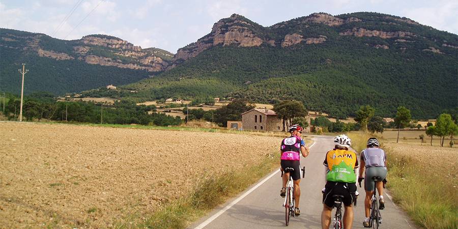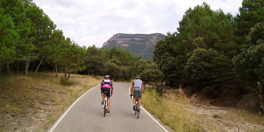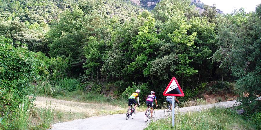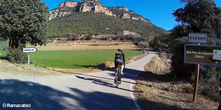 Descripción: Para situarnos un poco, digamos que nos encontramos en la parte más occidental de la barcelonesa comarca de Berguedà, lindando con la provincia de Lleida ya que, tras coronar, apenas quedan 500 m hasta la divisoria entre ambas provincias. En una zona muy despoblada, vamos a ascender hasta una meseta formada por los Plans de Taravil y de Traserra, a los pies de la Serra dels Tossals. Y no va a ser tarea fácil; basta con echar un rápido vistazo al perfil que presentamos. El primer kilómetro y medio va a ser un tramo bastante cómodo, sin más sobresaltos que un par de cortísimas rampas, la primera en el mismo punto de inicio. Esto nos permitirá ir disfrutando del entorno y de la tranquilidad que nos rodea, mientras vamos calentando las piernas. La situación cambia de forma brusca al llegar a la altura del cruce hacia la la iglesia de Sant Sadurní del Cint, donde el firme pasa a ser de hormigón y donde encontramos una señal del 16%. No os llaméis a engaño porque la pendiente máxima supera con creces esta cifra, hasta llegar en algún punto a la psicológica cifra del 20%. Por delante tenemos 2 km con una pendiente media del 12%, en los que no vamos a tener ningún punto por debajo del 10%. Sigue un descanso de 200 m para bajar un poco las pulsaciones, antes de acometer un postrer repecho de otros 800 m con un 13% de media y rampas de hasta el 18%. Los pocos cientos de metros que restan para coronar, de nuevo sobre asfalto, nos van a parecer poco más que un paseo. Todo el trecho hormigonado es un espectáculo, con varias herraduras muy cerradas y empinadas, con la ruta abriéndose paso a duras penas mordiendo el roquedo de la derecha y con un par de puntos que nos deparan unas maravillosas vistas hacia el valle, puntos en los que es casi obligatoria una pequeña parada para disfrutar de ellas y de paso para darnos un merecido respiro. Es difícil de situar la cima, ya que no hay ningún cartel y no es el típico puerto que tiene una vertiente opuesta. Ya hemos comentado que termina en una meseta y lo que sigue es prácticamente llano. Para finalizar, comentar que si no tenemos prisa, es del todo aconsejable no volver a descender por donde hemos subido, sino continuar adelante hacia Capolat atravesando toda la meseta, hasta alcanzar la BV-4241 a la altura de la boca del túnel de Capolat. Ese tramo es una delicia para la vista. Prácticamente llano, total ausencia de tráfico y un paisaje sin igual entre praderas de montaña, bosques autóctonos, masías aisladas y entrañables iglesias. Luego solo queda dirigirse hacia Berga y, antes de llegar, tomar una carretera que baja por el polígono industrial y sale a la C-26 para retornar al punto de inicio. |