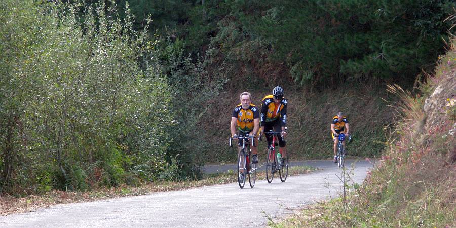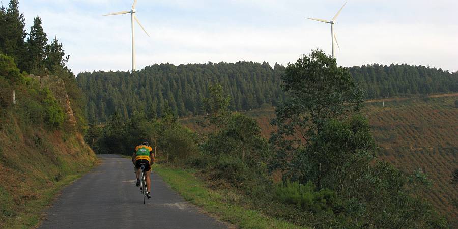Descripción: Nos encontramos en una de las comarcas menos habitadas de Asturias y en franca despoblación. El municipio o concejo de Salas, por el que discurre el 90% de trayecto, ha visto reducida su población a la cuarta parte respecto a la que tenía hace cien años. Este municipio lo conforman 28 parroquias, pero si descontamos las tres principales, Salas, Cornellana y La Espina, penas quedan 1800 habitantes para repartir entre las otras 25 y a su vez cada una de ellas está formada por varias aldeas o barrios. Los únicos medios de vida de estos pequeños núcleos poblacionales son la ganadería o explotaciones forestales. Además, las comunicaciones son complicadas. Por ejemplo, desde Lavio, para comprar cualquier cosa, el punto más cercano es la capital de municipio, Salas, y se encuentra a 25 km. Para nosotros, un lujo poder disfrutar de estos parajes, pero para los habitantes, en ocasiones tiene que resultar un tanto duro. De este puerto, que tiene varias vertientes, se habló bastante en 2025 ya que se está promocionando para que sea un final de etapa en La Vuelta y se espera que pueda ser para 2027, después de que la rabieta de su director, absurda a nuestro modo de ver, dejara sin etapas al 80% del territorio en el trazado para 2026, por los no menos absurdos hechos acaecidos en 2025, ajenos a los aficionados y a la gran mayoría de la población. No parece que sea ésta la vertiente elegida para tal circunstancia, pero a nuestro parecer es la más bonita, además de la más dura. Afortunadamente, lo más serio de este puerto lo vamos a encontrar al comienzo, con 2,8 km al 10,2% de pendiente media, sin un mínimo descanso. Los primeros 25 m ya nos regalan un 14% de pendiente, como avisándonos de lo que viene, pero esta cifra ya no se vuelve a repetir, aunque no bajamos del 9% en ningún punto de este tramo. Tramo que por cierto discurre a través de un cerrado bosque. Cuando empiezan a aparecer las primeras praderas llegamos a Lavio, la pendiente desaparece y las vistas se agrandan. Sigue un kilómetro llano hasta llegar a Socolina donde la carretera se estrecha, el firme empeora y nos metemos de nuevo en un tupido bosque, donde nos encontramos con casi cuatro kilómetros de falso llano y uno y medio al 8% antes de llegar a Elesquichón, donde se vuelve a abrir el panorama. Luego viene Buscabrero y 2 km al 7% con una pendiente muy regular hasta el cruce con la carretera que asciende desde Salas. Dos kilómetros largos muy suaves a través de un pinar y de repente la carretera se empina de forma brusca para iniciar el muro final. Y se inicia con 250 m al 13% y máxima del 16% hasta llegar al desvío a la derecha hacia nuestra meta, poco antes de coronar lo que sería el puerto de paso, aunque por la otra vertiente, la norte, son pistas de grava en buenas condiciones. En el desvío cogemos la carretera asfaltada en 2025 y que lleva a las antenas y al Pico Aguión. Serán aún 600 m al 10-11%. Ya en la cima, a disfrutar de las espléndidas vistas en todas direcciones. NOTA:Esta altimetría está dedicada a nuestro gran amigo y colaborador Rafa Goyanes, “Rafael de Xixón”, que tristemente nos dejó hace ya unos cuantos años. Era su puerto favorito. Sirvan como pequeño homenaje estas palabras que el escribió en su día: “Si subís en un día claro, de invierno y con viento podéis ver Burela, las Ubiñas, y al caer la tarde los Picos de Europa. Se ve también el Sueve, el Aramo, Puerto Ventana, el Acebo, el Naranco, la ría de Avilés, las bombonas de la Campa Torres sobre el puerto de Gijón, el Cabo Peñas y de noche las luces de Oviedo, el mechero de Aceralia, se adivina Gijón...” . ¡Va por ti, Rafa!