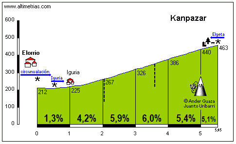 | Descripción: Tras superar el alto de la circunvalación a la histórica villa de Elorrio -si no hemos optado por recorrerla y admirar sus múltiples palacios, casonas, iglesias y rincones-, que ya empieza a notarse en las piernas, iniciaremos un falso llano a través de una larga recta que nos introduce en el suave y regular ascenso al Alto de Kanpazar (Campanzar todavía en algunos mapas). Las curvas son continuas bajo el arbolado que nos abandonará en toda la ascensión que apenas se acerca a los 5 kms y sin ninguna rampa digna de tal nombre. Se trata de una subida muy transitada por los cicloturistas de la zona que permite la charla amistosa mientras empezamos a descubrir las bellezas de los Montes del Duranguesado y, en especial, la peña de Udalaitz, que domina el paso del puerto. Si no fuera porque en el altímetro quedan reflejados los algo más de 400 m. de altitud, pensaríamos que nos hallamos en pleno corazón de los Pirineos. De ilusión también se vive … |
