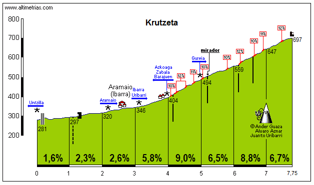 | Descripción: Ascensión muy conocida por los ciclistas vascos que suelen dirimir frecuentemente sus diferencias en estas rampas de suficiente entidad como para romper el grupo de los que se dicen “amigos”: será por aquello de que quien bien te quiere…Y bien que nos pueden hacer sufrir las rampas de este bello puerto del norte de Álava, lindante con los territorios de las provincias hermanas de Bizkaia y Gipuzkoa. Desde que abandonamos la localidad guipuzcoana de Arrasate-Mondragón la carretera toma una ligera inclinación ascendente que podemos catalogar, como poco, de falso llano. Al dejar a nuestra izquierda la subida al pueblo de Untzilla, otra ascensión de fuertes rampas, la nuestra se sitúa ya claramente entre el 2 y el 3%: es poco, sí, pero todo depende del ritmo de los colegas, porque al llegar a Aramaio la cosa ya se pone seria, primero, y muy seria, después, cuando alcanzamos la zona de herraduras que nos brindan un magnífico panorama sobre el valle alavés. Las rampas por encima del 10% se suceden con relativa frecuencia y van a ser nuestras piernas las que más claramente se resientan de la dureza de la ascensión. Dos de los kilómetros tienen una pendiente media prácticamente del 9%, lo que pone a las claras la veracidad de nuestra afirmación de que no se trata de un puerto de relleno en una etapa, sino más bien y en función de dónde se sitúe la meta, del auténtico juez de paz de cualquiera de ellas. Cuando llegamos a la altura de la fuente de hierro nuestras piernas agradecerán el descanso, aunque el gusto de esa agua ferruginosa no sea de lo más agradable para el paladar. Pero quizás el hierro que encierran sus partículas nos devuelva las fuerzas perdidas en el puerto. Y, al coronar, tenemos dos opciones: dejarnos caer de frente hacia Legutiano y el pantano de Villarreal o, si nos quedan ganas y queremos alejarnos del mundanal ruido, tomar a mano derecha en el mismo alto hacia la ermita de San Cristóbal, donde gozaremos de la mejor perspectiva del Valle de Aramayona, y descender luego por fuertes rampas hacia el núcleo bizkaino de Otxandiano. |