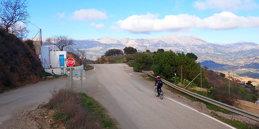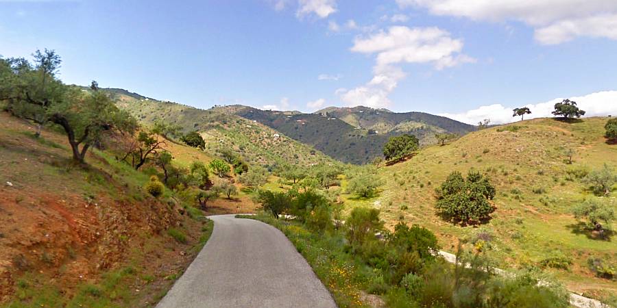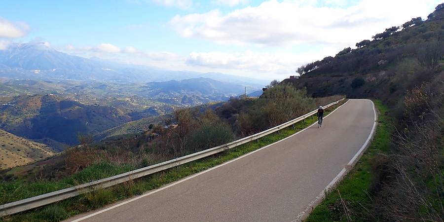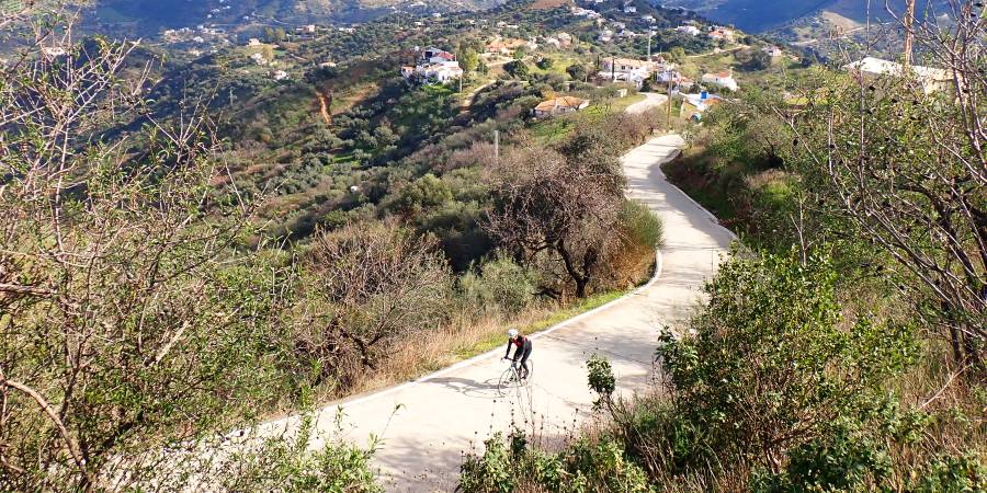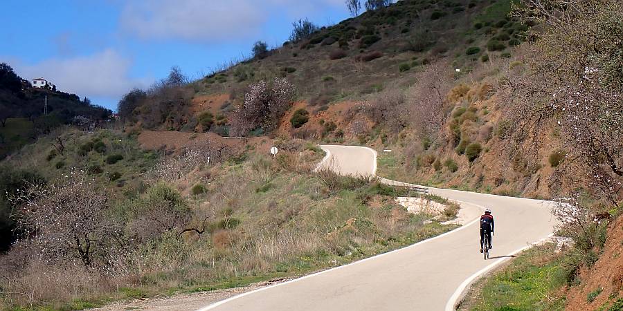 Descripción: Situada en plena comarca de la Axarquía, esta ascensión va a poner en contacto el valle del río Benamargosa con la población de Colmenar a través de un relieve alomado con grandes pendientes en las que el almendro sobre todo y el olivo en menor medida parecen aferrarse desesperadamente al terreno. Algunos manchones de viñas aparecen como vestigio de un pasado esplendoroso en el que la uva malagueña era el monocultivo propio de la zona hasta la aparición de la filoxera a finales del siglo XIX. Poco vamos a poder disfrutar de este sugestivo entorno ya que bastante vamos a tener con mirar al frente y mantener el equilibrio sobre nuestra querida compañera de fatigas puesto que, inmediatamente después de vadear el río de la Cueva, la carretera comienza a inclinarse de manera vertiginosa durante tres kilómetros que nos van a parecer eternos. Así es que sin reparo alguno, quienes lo tengan, deberán hacer uso del triple plato y buscar un desarrollo adecuado a sus posibilidades, ya que el primer kilómetro y medio se acerca al 12% de pendiente media y nuestro cuerpo se va a ver sometido a un descomunal esfuerzo. Poco antes de finalizar el segundo, nos encontramos con un corto tramo más suave que deberemos aprovechar para bajar las pulsaciones, ya que a continuación comienza el tramo más duro de la ascensión, con un kilómetro completo al 12,4% de media y puntas de hasta el 19-19%. El siguiente kilómetro, en descenso, nos servirá por un lado para recuperar el aliento y por otro para admirar las preciosas vistas que se nos presentan hacia el norte: Sierra de Camarolos, Sierra del Jobo, Sierra de Enmedio y las suaves lomas cerealistas del Pasillo de Colmenar-Periana. Inmediatamente vamos a retomar el ritmo de la ascensión durante otros tres kilómetros, aunque ya sin la dureza del inicio. No obstante, tendremos que superar aún varios tramos duros, sobre todo un tramo de 600 m, poco antes de finalizar, que también vuelve a superar el 12% de media.