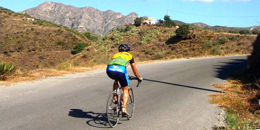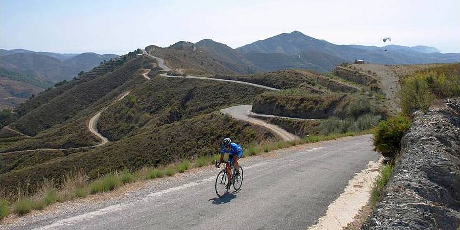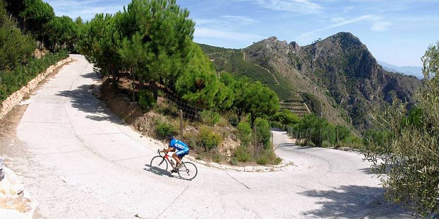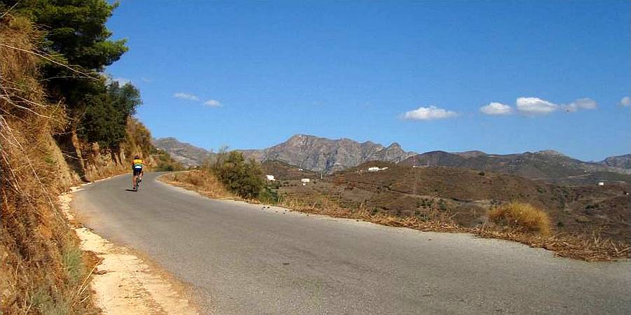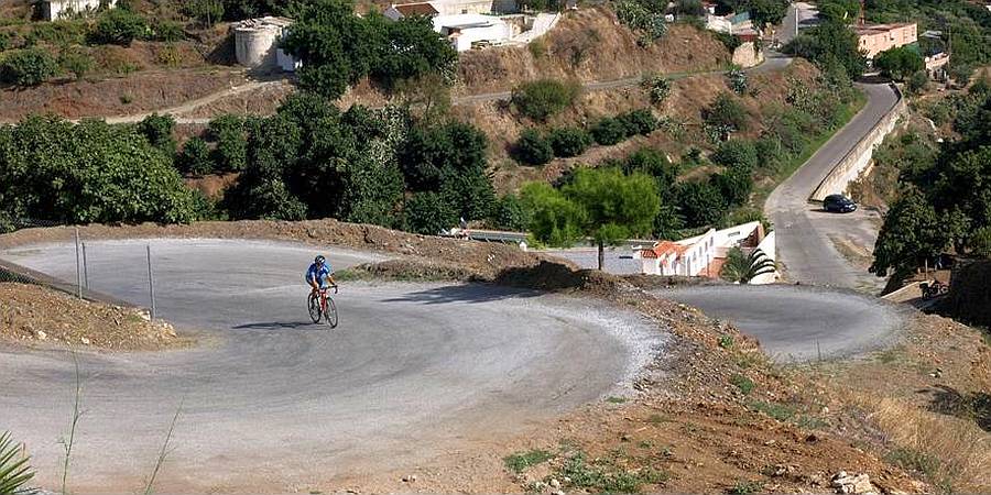 Descripción: En ese privilegiado rincón costero del sur de Granada en que se ubica Almuñécar, encontramos uno de los más inesperados parajes que un cicloturista pueda imaginar: el puerto más duro de España, quizás tras el Angliru (aunque esto es discutible), que finaliza en un antiguo parque zoológico en plena sierra de la Almijara a 1.200 m de altitud. Ese parque se cerró hacia 2017 debido al precario estado de los animales y, que se sepa, a finales de 2025 continúa cerrado. Desde 2021 parece que se ha solicitado la reapertura como Espacio Natural, pero a esta fecha aún no hay noticias de una nueva apertura. Así que lo más probable es que nos encontremos con la puerta cerrada en el km 10,8 y no podamos enfrentarnos a los tres terroríficos kilómetros finales. Esperemos que más pronto que tarde den una solución para llegar a la cima de este coloso. Toda la ascensión, si exceptuamos quizá los kilómetros más duros, presenta un perfil absolutamente irregular con continuos cambios bruscos en la pendiente. Ya en el primer kilómetro, aún entre las calles de Torrecuevas, nos enfrentaremos a rampas que rondan el 20%, si bien algunos descansillos nos conceden respiro mientras nos hacemos a la idea de lo que nos aguarda. Tras el paso bajo la autovía, llama la atención una especie de rosca de tornillo que se retuerce en la ladera de enfrente hacia la que nos dirigimos. Atravesado el puentecillo sobre el arroyo Seco, una brutal rampa se sitúa ya por encima del 20% para hacer frente a continuación a un total de siete herraduras en un kilómetro por encima del 13% de pendiente media. Pero es que el siguiente tramo kilométrico, al 12%, nos exige un esfuerzo descomunal por cuanto también nos opone rampas que llegan a ese inhumano, por ahora, 20%. Será tras salir de una doble herradura cuando la pendiente media de la subida vaya en progresivo descenso y varios tramos de descanso nos permiten recuperar la mente, casi más que las cansadas piernas. Abandonamos los cultivos tropicales a la par que ganamos la cuerda de la montaña por la que vamos a crestear durante los siguientes kilómetros. A esta altura de la subida la cuesta se ha tornado irregular, con constantes repechones de fuerte pendiente y descansillos. La vegetación tropical abandona el margen de la carretera, quedando los bancales en las laderas vecinas; sólo algunos chalets y albercas jalonan nuestro camino. Pero pronto, la visión frente a nosotros de la carretera ascendiendo recta por una ladera nos produce un escalofrío. El susto no será en vano, ya que se trata de un tramo de poco más de 200 m. en que la pendiente no baja del 20%… Suerte que luego nos topamos con un último falso llano previo a la traca final, porque el “repechito” nos dejará mermadas las fuerzas de cara a los últimos 4 km. La pendiente irá in crescendo hasta superar claramente la inhumana cifra del 20% (anotamos alguna rampa al 26-27%), pero en esta ocasión, además, lo hará de forma mantenida durante un kilómetro completo. La elección del desarrollo se torna esencial llegados a este punto. El portón de “Peña Escrita” además de entrada al parque, marca el inicio de ese devastador kilómetro al 16%. El abrupto paisaje, la roca escarpada, se hallan en perfecta consonancia con la cuesta, si bien, apenas podremos apartar la mirada de la carretera mientras nos esforzamos por mantener el equilibrio para no acabar con los huesos en ella. El hormigón viene a sustituir el asfalto en los dos últimos kilómetros, aunque la pendiente en un tramo intermedio se vuelve algo más humana: a estas alturas consideraremos descansillo una rampa del 10%. Pasado el cartel indicativo del “Mirador de los Leones” la fiereza del puerto vuelve a mostrarse en su máxima expresión dándonos un buen zarpazo con unas rampas que llegan al 25-26%. Tras varias herraduras alcanzamos el Mesón Cantalobos, cerrado en la actualidad, y por unos momentos pensamos que ya está todo hecho, hasta que nos percatamos de que a nuestra izquierda el cemento sigue remontando la montaña… Unos últimos cientos de metros a más del 15%, una última herradura a derechas, la pista de despegue de parapentes y allí, junto a una casetilla, la carretera muere, sin salida alguna. Insípido postre para un menú tan suculento. Las vistas, eso sí, no defraudan: la Almijara, con la carretera de la Cabra Montés rayando la montaña, el Mediterráneo, Sierra Nevada, la Sierra de Lújar… Desde luego, no se le puede pedir más a un puerto. |