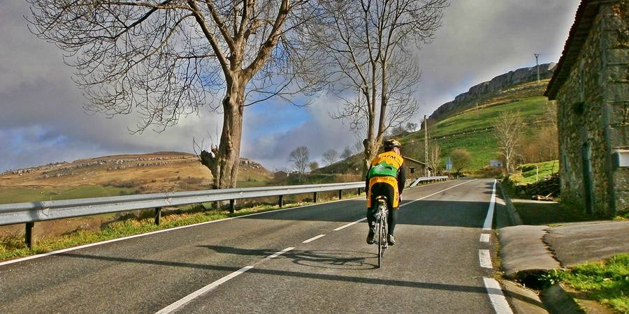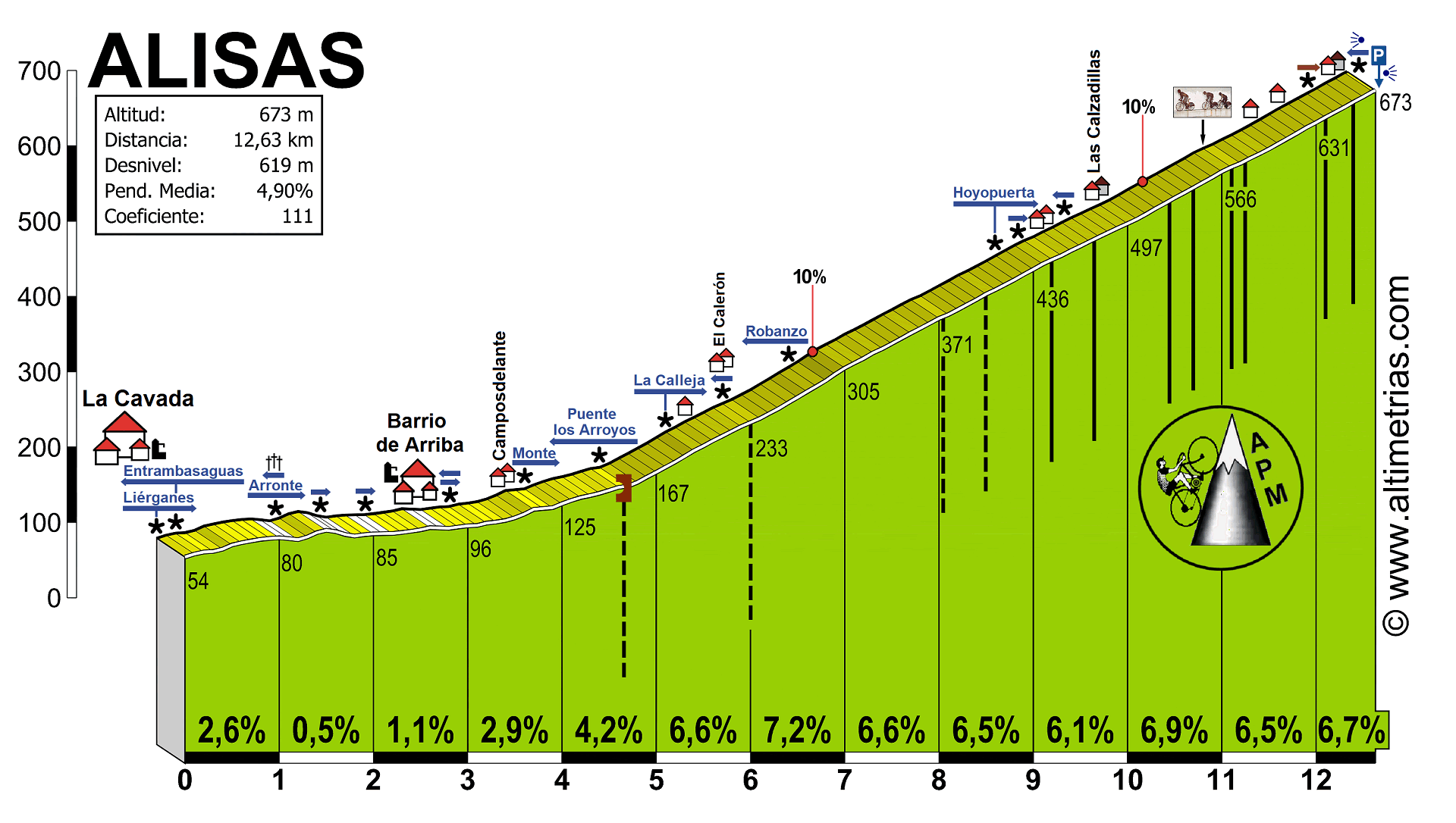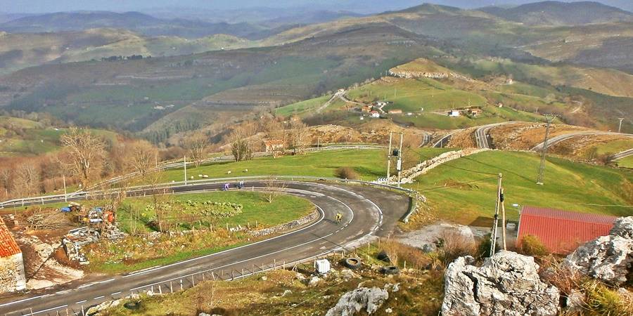 | Descripción: La histórica villa de La Cavada, famosa por sus fábricas de cañones en siglos pasados y cercana a las conocidas aguas de Solares, nos despide desde su representativo Arco de Carlos III, que nos recuerda épocas grandes ya olvidadas. Los primeros kilómetros apenas pueden ser considerados como puerto, que no se inicia hasta dejar atrás Barrio de Arriba. Poco antes de El Calerón la pendiente media se sitúa por encima del 6% hasta que coronamos en su punto más alto. En la zona final del puerto, desde el barrio de Las Calzadillas, el paisaje es de una belleza espectacular, y las rocas se adueñan definitivamente de todo lo que aparece a nuestra vista. Sucesivas y casi enlazadas curvas de herradura nos permiten avanzar por esos parajes rocosos cambiando continuamente nuestra perspectiva hasta completar una escalada que dejará un bonito recuerdo en la memoria. El Mirador que se encuentra en el Alto, a la izquierda, al que se puede acceder en bici, nos brindará un panorama aún más sugerente, si cabe, que el que nos ha ido acompañando en nuestro recorrido. Quizás no pueda ser considerado como un Primera, pero si la velocidad de ascensión es exigente, no va a quedarnos duda de que tampoco es tan exagerada esa catalogación. |