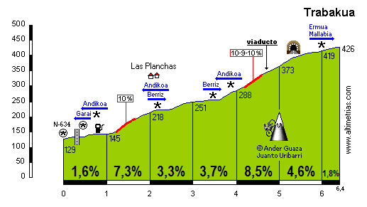 | Descripción: Puerto muy transitado por los cicloturistas de Bizkaia y que, tras el trazado realizado hace ya bastantes años, ha perdido gran parte del encanto que el antiguo, mucho más curvilíneo y sombreado, poseía. El actual es mucho más monótono, muy rectilíneo y también algo más duro al haber aumentado la pendiente media general. Ambas vertientes alcanzan en algún momento el 10% y atraviesan sendos túneles antes de llegar a la zona de falso llano con que ambas quedan unidas junto al Asador y el Área Recreativa del alto, de donde podemos también optar por descender hacia Ermua. En esta que sube desde la N-634 deberemos haber superado en primer lugar un kilómetro de bastante dureza en el tramo conocido como Las Planchas, justo antes de alcanzar la población de Berriz. Pero en ningún caso podremos justificar nuestro miedo a la ascensión ni en su distancia, inferior a los 7 kms, ni en rampas terroríficas, que no existen aunque sí algún tramo de cierta entidad, como hemos señalado. Las vistas desde esta ladera sobre los Montes del Duranguesado son espectaculares. |