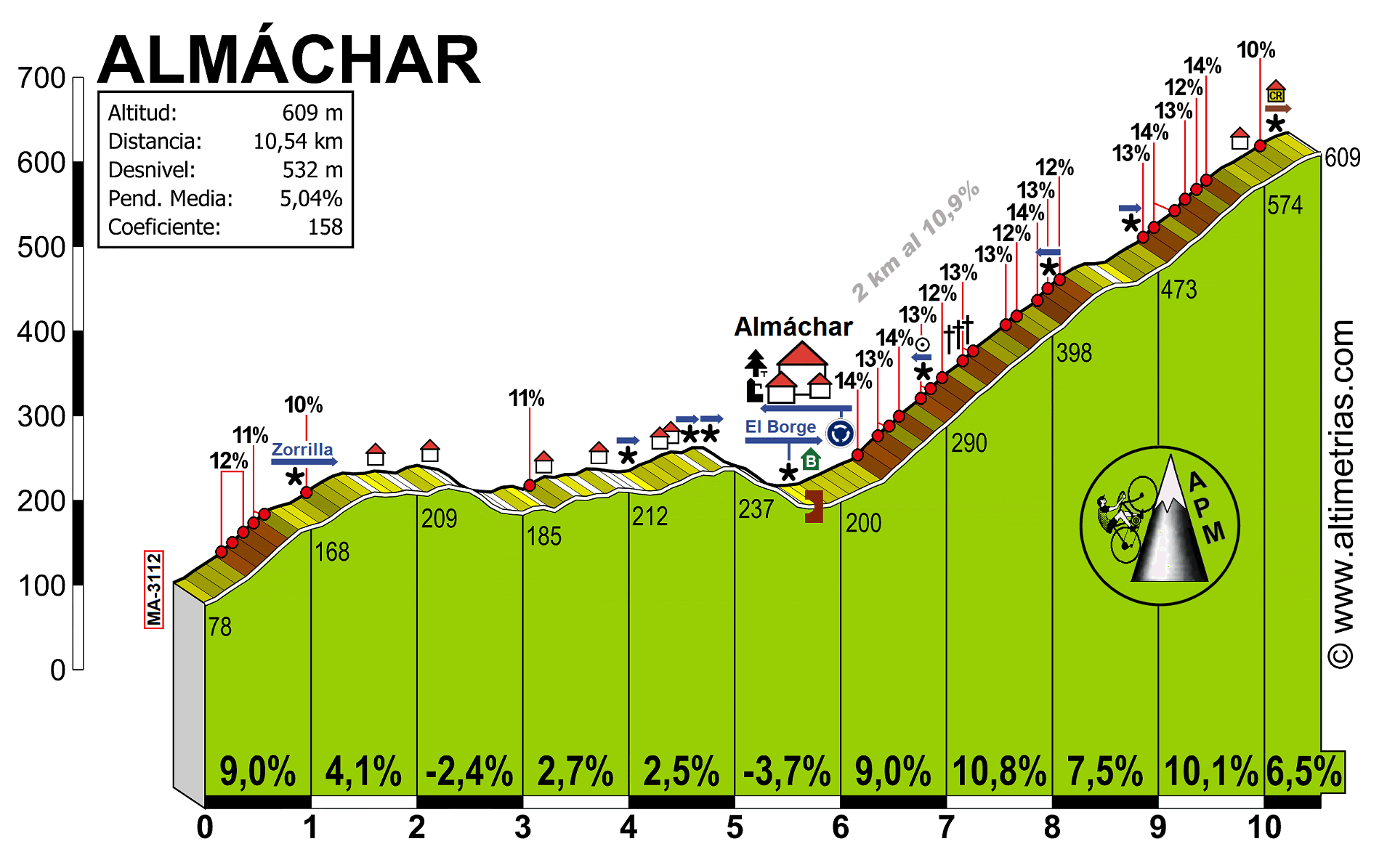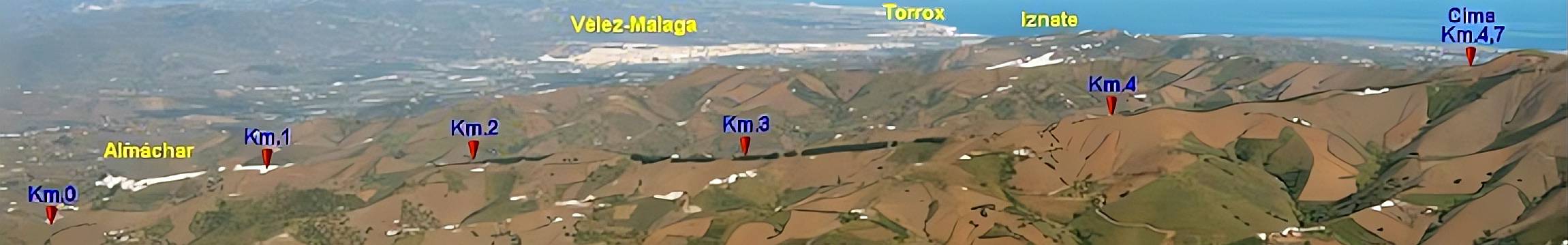 Descripción: Curioso que a este puerto se le conozca por dos nombres diferentes, uno por cada vertiente. Es que además, ningún mapa topográfico refleja el nombre del puerto. Por el lado norte se le conoce como puerto de Almáchar y por el sur es Moclinejo, en función de las localidades por las que se pasa. Quizá se deba a que esta carretera que une ambos pueblos, es de relativamente nuevo cuño, porque fue construida alrededor de 1970. Hasta entonces, los vecinos de Almáchar, para llegar a Málaga capital tenían que ir hasta Vélez Málaga y luego seguir la carretera de la costa, recorriendo una distancia de casi el doble respecto a la actual. Almáchar, único núcleo habitado junto al que vamos a pasar, es un precioso pueblo que enamora a primera vista. Quien tenga espíritu turístico no debe perder la oportunidad de desviarse un poco para llegar a él. No va a encontrar ningún edificio histórico de relumbrón, pero sus calles acaparan todos los adjetivos que se les quiera aplicar: bellas, adoquinadas, tortuosas, laberínticas, empinadas… Y por supuesto el colofón lo ponen sus inmaculadas casas encaladas. Todo un entrañable caos urbanístico. Es fácil perderse, porque en dos minutos te has desorientado por completo. Almáchar es considerada la “Capital de la Uva Pasa Moscatel”, ya que es el núcleo principal donde se cosecha y trata este delicioso fruto en la comarca de La Axarquía malagueña. Un producto considerado Patrimonio Agrícola mundial. Esperemos que se mantenga, porque la presión del cultivo de nuevos frutos (aguacates, mangos y sobre todo níspero japonés) aumenta sin parar. Referente al puerto, puede extrañar un poco dónde hemos situado el punto de comienzo. Pero es que para llegar a Almáchar, necesariamente tenemos que pasar por ahí, salvo que ascendamos por Moclinejo. Y el primer kilómetro es muy duro, con un tramo de 500 m al 12% de media que se atraganta un poco porque la carretera es casi recta y tenemos la sensación de no avanzar. La pendiente disminuye hasta llegar a mitad del segundo kilómetro, donde comienza un largo tramo de toboganes hasta finalizar el quinto. En esta parte tenemos amplias vistas en todas direcciones ya que circulamos por un cordal entre salteadas plantaciones frutales que hemos comentado antes. Al poco ya damos vista a lo lejos hacia Almáchar, en la ladera frente a nosotros. Un rápido descenso nos lleva hasta el río y tras 500 m de suave ascenso llegamos a la rotonda de entrada a Almáchar. Y aquí solo queda el sálvese quien pueda, porque comienza el muro final. No vamos a encontrarnos con rampas tremendas, ya que no pasamos del 14%, pero no vamos a tener mas que un mínimo descanso mediado el noveno kilómetro. Así pues, buscad el desarrollo más adecuado y comenzad con prudencia por cuanto nos esperan 2 km al 11% de pendiente media que se hacen muy largos. En esta parte comenzamos a ver, desperdigados por las laderas los viñedos que proporcionan la uva de moscatel, que luego se convertirá en pasas. Incluso hay varios junto a la carretera, pero casi todos están muy bien cercados para evitar tentaciones. Solo queda aprovechar bien el pequeño descanso que hemos comentado y atacar el repecho final, idéntico en dureza al anterior, pero en esta ocasión son solo 800 m. Lo poco que queda para coronar es ya más llevadero.