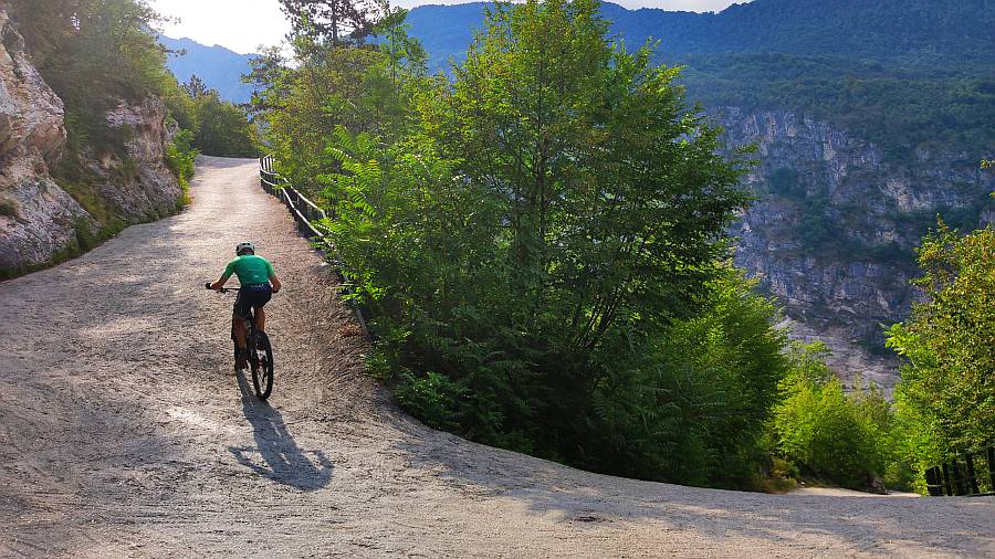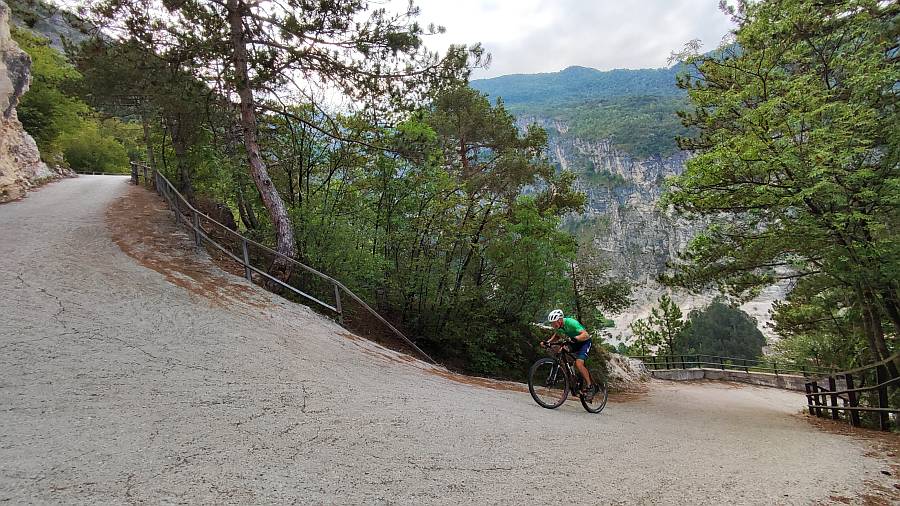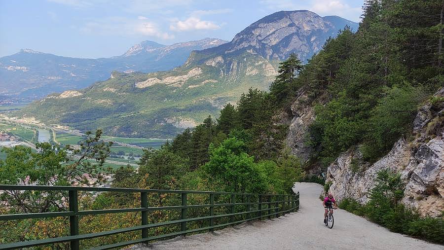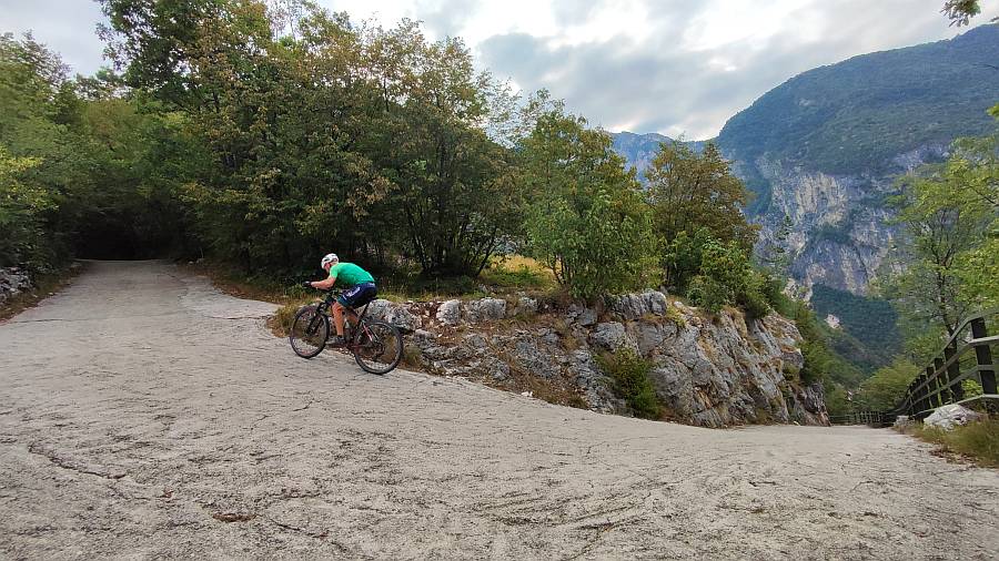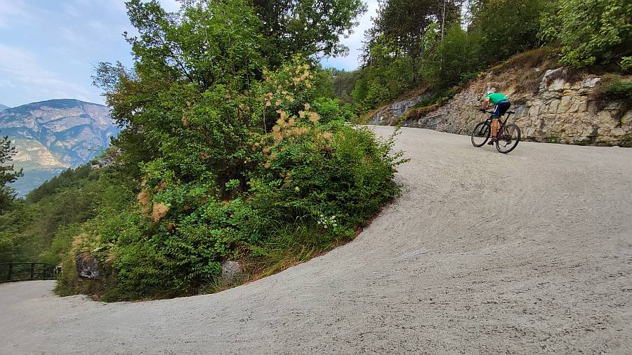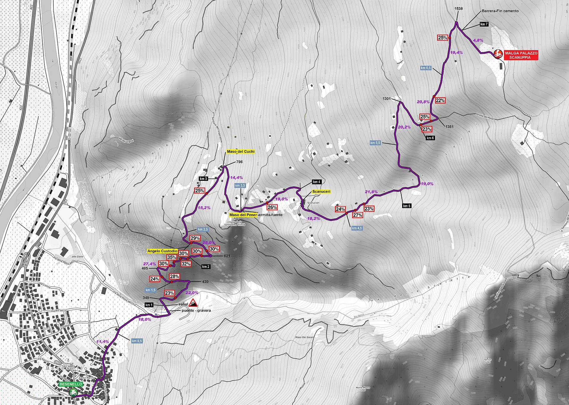 Descripción: Este puerto es conocido en la zona como Vía Scanuppia, una pista de montaña, ahora hormigonada, que nos lleva hasta una pradería de montaña donde se asienta el palacio Malga. Este edificio originario del siglo XVI, fue en principio una fortificación para controlar y defender el territorio y el acceso al valle. Luego fue usado para actividades cinegéticas y pastoriles, y en tiempos más modernos fue residencia de verano de la famosa familia Trapp. Este puerto, junto a su vecino Pozza San Glisente están considerados como los puertos más duros del mundo, aunque a buen seguro habrá otros a considerar porque el mundo es muy grande. Definir esta subida es fácil: solo para locos, pero que muy muy locos. En nuestro maillot luce eso de “Los locos de las cumbres”, pero entiéndase que nos referimos a una locura ponderada hasta ciertos límites. Nunca se nos ocurriría acometer un reto como éste, fundamentalmente porque está fuera de nuestra capacidad física. Pero bueno, ya que unos compañeros de fatigas menores (las fatigas, no los compañeros), y sobre todo grandes amigos, se atrevieron con este coloso y lo midieron, traemos a estas líneas sus datos y algunas de sus impresiones. Lo primero, sentar las bases del material necesario: olvidarse de llevar una bici de carretera convencional. Solo recomendamos gravel o BTT. Y un desarrollo de al menos 30x42 o mejor 30x50. Y por supuesto, preparar la ergonomía de la bici para esas rampas: sillín adelantado y manillar lo más bajo posible porque hay que adelantar el c.d.g. si no queremos hacer un caballito. Y no olvidarse de unos buenos frenos, porque el descenso es durísimo. Mejor de disco, porque si tenemos frenos de zapatas vamos a tener que parar unas cuantas veces para refrigerar las llantas. No estamos ante una ascensión demasiado vistosa, ya que toda ella discurre por el interior de un cerrado bosque, pero tiene su belleza. Yendo con sus datos, el gráfico lo dice casi todo. La pendiente va aumentando gradualmente desde el inicio hasta casi finalizar el primer km, donde ya tonteamos con el 20%. Ese tramo es el único que está asfaltado. Encontramos un puente, un cruce a una cantera que vemos y 100 m de descenso para entrar en el hormigón. Ahí comienza el infierno, con una señal que indica un 45% de pendiente, cifra a todas luces exagerada. Quizá pueda tener ese porcentaje en algún punto del interior de una herradura, pero éstas son salvables tomándolas por el exterior. Este segundo tramo hasta llegar a Angelo Custode, una hornacina con un ángel enclavada en la roca, son 1550 m con una pendiente media cercana al 25%, contando con que un kilómetro completo dentro de dicho tramo llega a la increíble cifra del 27,1% de media. Ahí casi todo el mundo tendrá que hacer una o más paradas intermedias y habrá que elegir, si es posible, el mejor sitio para volver a montar, tarea nada fácil. En este tramo encontramos la pendiente máxima de toda la ascensión, nada menos que un 35%!. Vienen luego unos cientos de metros más llevaderos, para volver a una tónica por encima del 20% hasta el final, si exceptuamos los 400 m finales que ya hemos comentado que son de tierra y muy poca pendiente. Si se quita el kilómetro inicial y esos metros finales, los otros 6 km arrojan una pendiente media del 20,2%. Sobran comentarios.